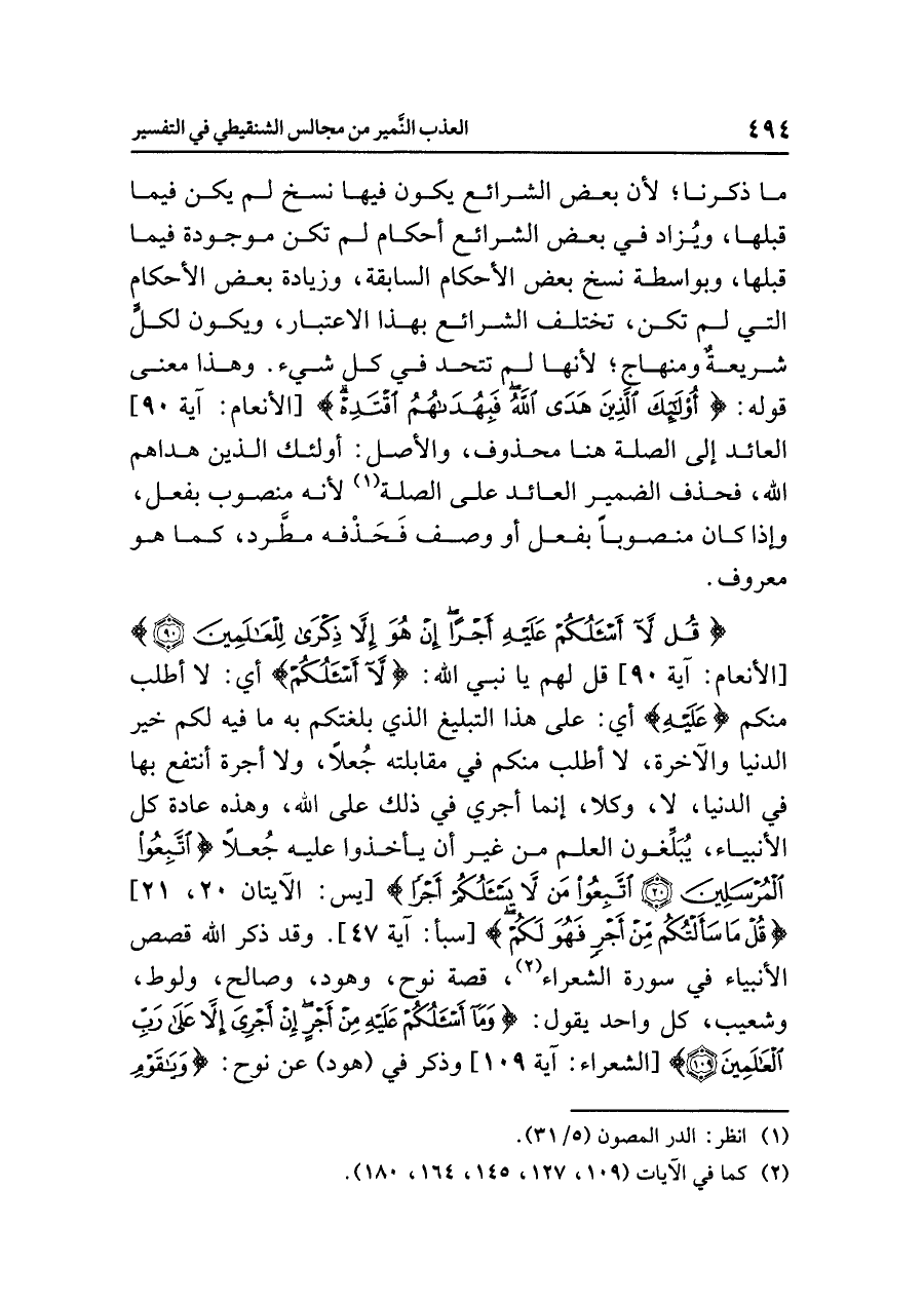 {قُل لَاّ أَسْأَلُكُمْ عَلَيْهِ أَجْرًا إِنْ هُوَ إِلَاّ ذِكْرَى لِلْعَالَمِينَ} [الأنعام: آية ٩٠] قُلْ لهم يَا نَبِيَّ اللَّهِ: {لَاّ أَسْأَلُكُمْ} أَيْ: لَا أطلبُ منكم {عَلَيْهِ} أي: على هذا التبليغِ الذي بَلَّغْتُكُمْ به ما فيه لكم خيرُ الدنيا والآخرةِ، لَا أَطْلُبُ منكم في مقابلتِه جُعْلاً، ولا أجرةً أنتفعُ بها في الدنيا، لَا وَكَلَاّ، إنما أَجْرِي في ذلك على اللَّهِ، وهذه عادةُ كُلِّ الأنبياءِ، يُبَلِّغُونَ العلمَ من غيرِ أن يَأْخُذُوا عليه جُعْلاً {اتَّبِعُوا الْمُرْسَلِينَ (٢٠) اتَّبِعُوا مَنْ لَا يَسْأَلُكُمْ أَجْرًا} [يس: الآيتان ٢٠، ٢١] {قُلْ مَا سَأَلْتُكُم مِّنْ أَجْرٍ فَهُوَ لَكُمْ} [سبأ: آية ٤٧] وقد ذَكَرَ اللَّهُ قصصَ الأنبياءِ في سورةِ الشعراءِ (¬٢)،