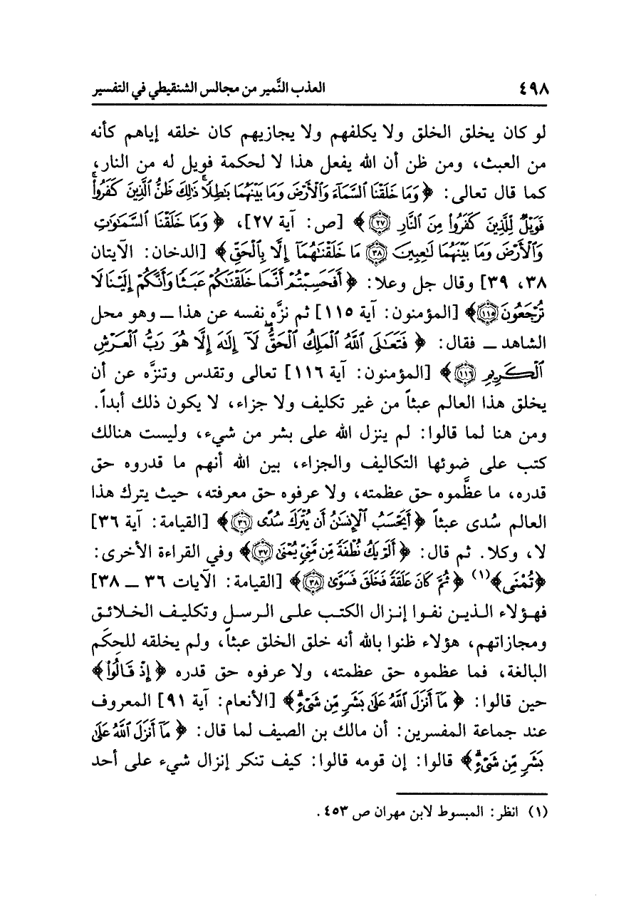 لو كان يخلقُ الخلقَ ولا يُكَلِّفُهُمْ ولَا يُجَازِيهِمْ كَانَ خَلْقُهُ إياهم كأنه مِنَ الْعَبَثِ، وَمَنْ ظَنَّ أن اللَّهَ يفعلُ هذا لَا لِحِكْمَةٍ فَوَيْلٌ لَهُ مِنَ النَّارِ، كما قال تعالى: {وَمَا خَلَقْنَا السَّمَاءَ وَالْأَرْضَ وَمَا بَيْنَهُمَا بَاطِلاً ذَلِكَ ظَنُّ الَّذِينَ كَفَرُوا فَوَيْلٌ لِّلَّذِينَ كَفَرُوا مِنَ النَّارِ} [ص: آية ٢٧] {وَمَا خَلَقْنَا السَّمَاوَاتِ وَالأرْضَ وَمَا بَيْنَهُمَا لَاعِبِينَ (٣٨) مَا خَلَقْنَاهُمَا إِلَاّ بِالْحَقِّ} [الدخان: الآيتان ٣٨، ٣٩] وقال جل وعلا: {أَفَحَسِبْتُمْ أَنَّمَا خَلَقْنَاكُمْ عَبَثًا وَأَنَّكُمْ إِلَيْنَا لَا تُرْجَعُونَ} [المؤمنون: آية ١١٥] ثُمَّ نزَّه نفسَه عن هذا - وهو محلُّ الشاهدِ - فقال: {فَتَعَالَى اللَّهُ الْمَلِكُ الْحَقُّ لَا إِلَهَ إِلَاّ هُوَ رَبُّ الْعَرْشِ الْكَرِيمِ} [المؤمنون: آية ١١٦] تَعَالَى وَتَقَدَّسَ وَتَنَزَّهَ عن أن يخلقَ هذا العالمَ عَبَثًا من غيرِ تكليفٍ ولَا جزاءٍ، لا يكونُ ذلك أبدًا. وَمِنْ هنا لَمَّا قالوا: لَمْ يُنْزِلِ اللَّهُ على بَشَرٍ مِنْ شَيْءٍ، وليست هنالك كُتُبٌ على ضَوْئِهَا التكاليفُ والجزاءُ، بَيَّنَ اللَّهُ أنهم ما قَدَرُوهُ حَقَّ قَدْرِهِ، ما عَظَّمُوهُ حَقَّ عَظَمَتِهِ، وَلَا عَرَفُوهُ حَقَّ مَعْرِفَتِهِ، حيث يتركُ هذا العَالَمَ سُدًى عَبَثًا: {أَيَحْسَبُ الْإِنسَانُ أَنْ يُتْرَكَ سُدًى} [القيامة: آية ٣٦] لَا وَكَلَاّ. ثم قَالَ: {أَلَمْ يَكُ نُطْفَةً مِّن مَّنِيٍّ تُمْنَى} وفي القراءةِ الأُخْرَى: {يُمْنَى} (¬١)
