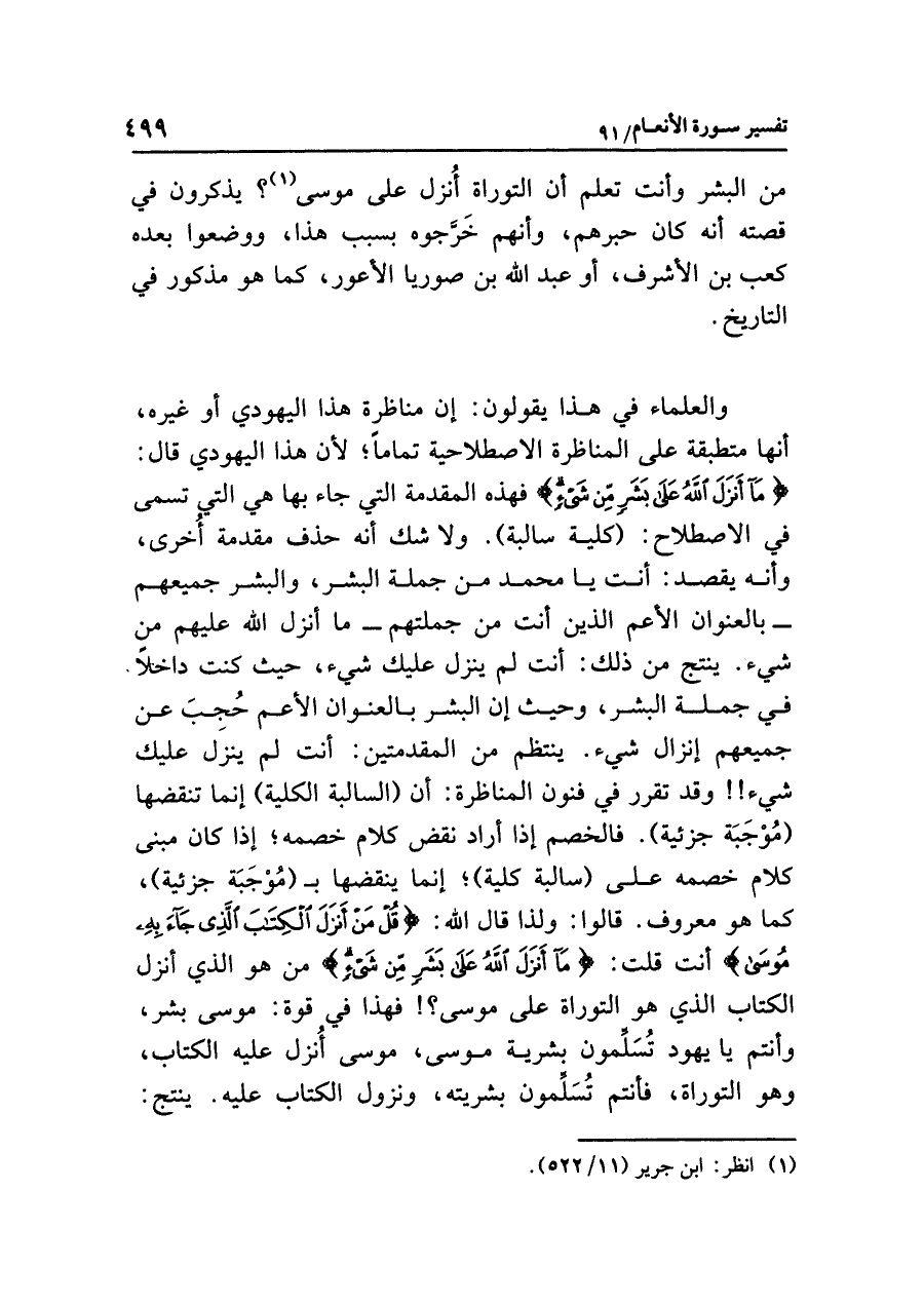 والعلماءُ في هذا يقولونَ: إن مناظرةَ هذا اليهوديِّ أو غيرِه أنها متطبقةٌ على المناظرةِ الاصطلاحيةِ تَمَامًا؛ لأَنَّ هذا اليهوديَّ قال: {مَا أَنزَلَ اللَّهُ عَلَى بَشَرٍ مِّنْ شَيْءٍ} فهذه المقدمةُ التي جاء بها هي التي تُسَمَّى في الاصطلاحِ: (كُلِّيَةٌ سَالِبَةٌ). وَلَا شَكَّ أَنَّهُ حَذَفَ مقدمةً أُخْرَى، وأنه يَقْصِدُ: أنتَ يَا مُحَمَّدُ مِنْ جُمْلَةِ البشرِ، والبشرُ جَمِيعُهُمْ - بالعنوانِ الأَعَمِّ الذين أنتَ مِنْ جُمْلَتِهِمْ - ما أَنْزَلَ اللَّهُ عليهم مِنْ شَيْءٍ. ينتجُ من ذلك: أنتَ لَمْ يُنْزَلْ عليكَ شيءٌ، حيثُ كنتَ داخلاً في جملةِ البشرِ، وحيثُ إن البشرَ بالعنوانِ الأَعَمِّ حُجِبَ عن جميعِهم إنزالُ شيءٍ. ينتظمُ مِنَ الْمُقَدِّمَتَيْنِ: أنتَ لَمْ يُنْزَلْ عليك شَيْءٌ!! وقد تَقَرَّرَ في فنونِ المناظرةِ: أن (السالبةَ الكليةَ) إنما تَنْقُضُهَا (مُوجَبَةٌ جُزْئِيَّةٌ). فَالْخَصْمُ إذا أَرَادَ نقضَ كلامِ خَصْمِهِ؛ إذا كان مَبْنَى كلامِ خَصْمِهِ على (سَالِبَةٍ كُلِّيَّةٍ)؛ إنما يَنْقُضُهَا بـ (مُوْجَبَةٍ جُزْئِيَّةٍ)، كما هو معروفٌ. قالوا: وَلِذَا قال اللَّهُ: {قُلْ مَنْ أَنْزَلَ الْكِتَابَ الَّذِي جَاءَ بِهِ مُوسَى} أَنْتَ قُلْتَ: {مَا أَنزَلَ اللَّهُ عَلَى بَشَرٍ مِّن شَيْءٍ} مَنْ هو الذي أَنْزَلَ الكتابَ الذي هو التوراةُ على مُوسَى؟! فهذا في قوةِ: مُوسَى بَشَرٌ، وأنتم يا يهودُ تُسَلِّمُونَ بشريةَ مُوسَى، مُوسَى أُنْزِلَ عليه الكتابُ، وهو التوراةُ، فَأَنْتُمْ تُسَلِّمُونَ بَشَرِيَّتَهُ، ونزولَ الكتابِ عليه. ينتجُ: