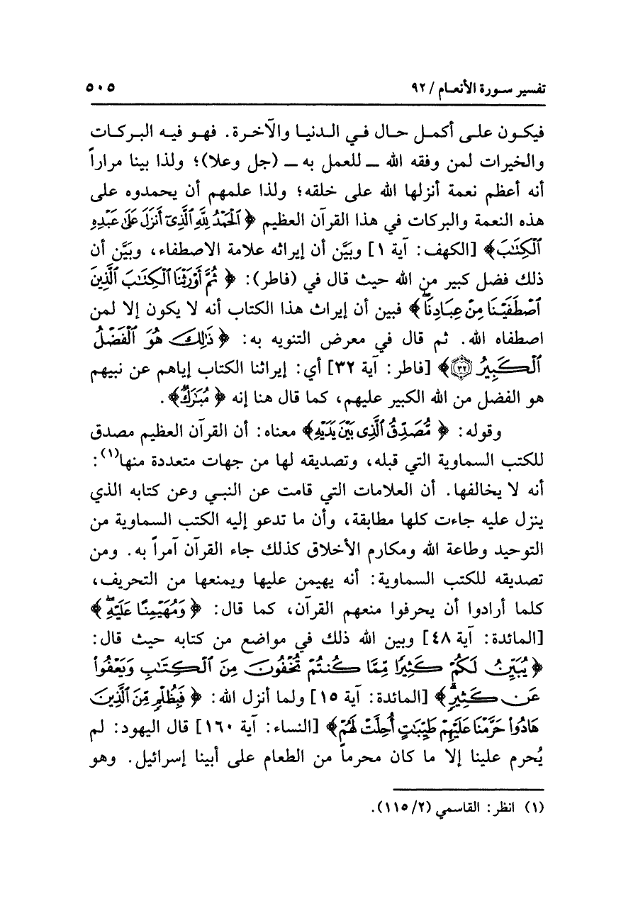 السماويةِ: أنه يُهَيْمِنُ عليها ويمنعُها من التحريفِ، كُلَّمَا أَرَادُوا أن يُحَرِّفُوا مَنَعَهُمُ القرآنُ، كما قال: {وَمُهَيْمِنًا عَلَيْهِ} [المائدة: آية ٤٨] وَبَيَّنَ اللَّهُ ذلك في مواضعَ من كتابِه حيث قال: {يُبَيِّنُ لَكُمْ كَثِيرًا مِّمَّا كُنْتُمْ تُخْفُونَ مِنَ الْكِتَابِ وَيَعْفُو عَنْ كَثِيرٍ} [المائدة: آية ١٥] وَلَمَّا أَنْزَلَ اللَّهُ: {فَبِظُلْمٍ مِّنَ الَّذِينَ هَادُوا حَرَّمْنَا عَلَيْهِمْ طَيِّبَاتٍ أُحِلَّتْ لَهُمْ} [النساء: آية ١٦٠] قال اليهودُ: لَمْ يُحَرَّمْ عَلَيْنَا إِلَاّ ما كانَ مُحَرَّمًا من الطعامِ على أَبِينَا إِسْرَائِيلَ. وهو