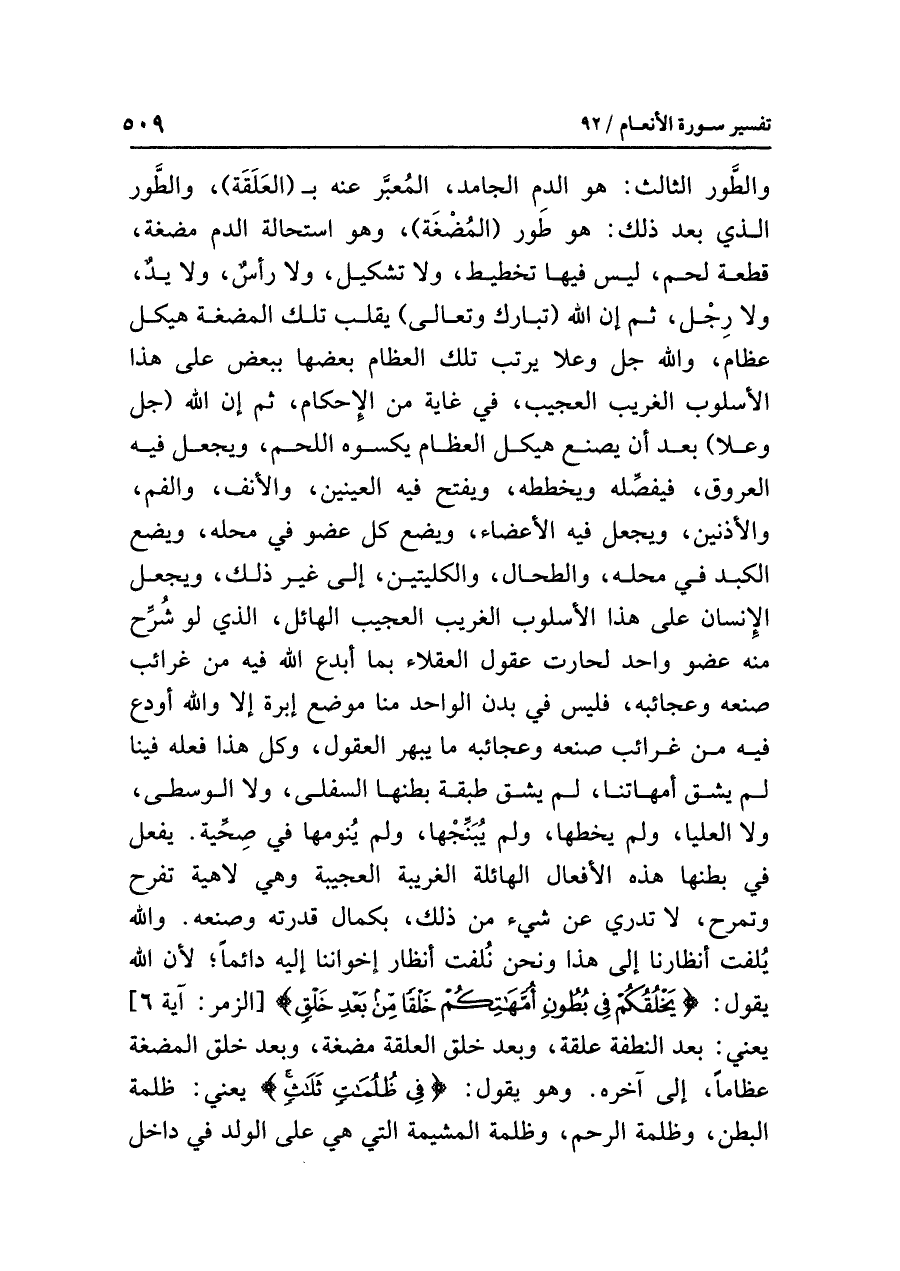 والطَّورُ الثالثُ: هو الدمُ الجامدُ الْمُعبَّرُ عنه بـ (العَلَقَةِ)، والطَّورُ الذي بَعْدَ ذلك: هو طَورُ (الْمُضْغَةِ)، وهو استحالةُ الدمِ مضغةً، قطعةَ لَحْمٍ، ليس فيها تَخْطِيطٌ وَلَا تَشْكِيلٌ ولَا رأسٌ ولَا يَدٌ ولَا رِجْلٌ، ثم إن اللَّهَ (تبارك وتعالى) يُقَلِّبُ تلكَ المضغةَ هيكلَ عِظَامٍ، وَاللَّهُ (جل وعلا) يُرَتِّبُ تلك العظامَ بعضَها ببعضٍ على هذا الأسلوبِ الغريبِ العجيبِ، في غايةٍ من الإحكامِ، ثم إن اللَّهَ (جل وعلا) بعدَ أن يصنعَ هيكلَ العظامِ يَكْسُوهُ اللَّحْمُ، ويجعلُ فيه العروقَ، فَيُفَصِّلُهُ وَيُخَطِّطُهُ، ويفتحُ فيه الْعَيْنَيْنِ، والأنفَ والفمَ والأُذُنَيْنِ، ويجعلُ فيه الأعضاءَ، ويضعُ كُلَّ عضوٍ في مَحَلِّهِ، ويضعُ الكبدَ في مَحَلِّهِ، والطحالَ وَالْكُلْيَتَيْنِ، إلى غيرِ ذلك، ويجعلُ الإنسانَ على هذا الأسلوبِ الغريبِ العجيبِ الهائلِ، الذي لو شُرِّحَ منه عضوٌ واحدٌ لَحَارَتْ عقولُ العقلاءِ بما أَبْدَعَ اللَّهُ فيه من غرائبِ صُنْعِهِ وعجائبِه، فليس في بدنِ الواحدِ منا مَوْضِعُ إبرةٍ إلا وَاللَّهُ أَوْدَعَ فيه من غرائبِ صُنْعِهِ وعجائبِه ما يُبْهِرُ العقولَ، وَكُلُّ هذا فَعَلَهُ فينا لم يَشُقَّ أُمَّهَاتِنَا، لَمْ يَشُقَّ طَبَقَةَ بَطْنِهَا السُّفْلَى وَلَا الْوُسْطَى ولا الْعُلْيَا وَلَمْ يَخُطَّهَا، ولم يُبَنِّجْهَا، وَلَمْ يُنَوِّمْهَا في صِحِّيةٍ. يفعلُ في بطنِها هذه الأفعالَ الهائلةَ الغريبةَ العجيبةَ وهي لاهيةٌ تَفْرَحُ وَتَمْرَحُ، لَا تَدْرِي عَنْ شيءٍ من ذلك، بكمالِ قدرتِه وَصُنْعِهِ. وَاللَّهُ يُلْفِتُ أنظارَنا إلى هذا ونحن نُلْفِتُ أنظارَ إخوانِنا إليه دائمًا؛ لأن اللَّهَ يقولُ: {يَخْلُقُكُمْ فِي بُطُونِ أُمَّهَاتِكُمْ خَلْقًا مِنْ بَعْدِ خَلْقٍ} [الزمر: آية ٦] يعني: بعدَ النطفةِ علقةً، وبعدَ خلقِ العلقةِ مضغةً، وبعدَ خلقِ المضغةِ عظامًا، إلى آخِرِهِ. وهو يقولُ: {فِي ظُلُمَاتٍ ثَلَاثٍ} يعنِي: ظلمةَ البطنِ، وظلمةَ الرحمِ، وظلمةَ المشيمةِ التي هي على الولدِ في داخلِ