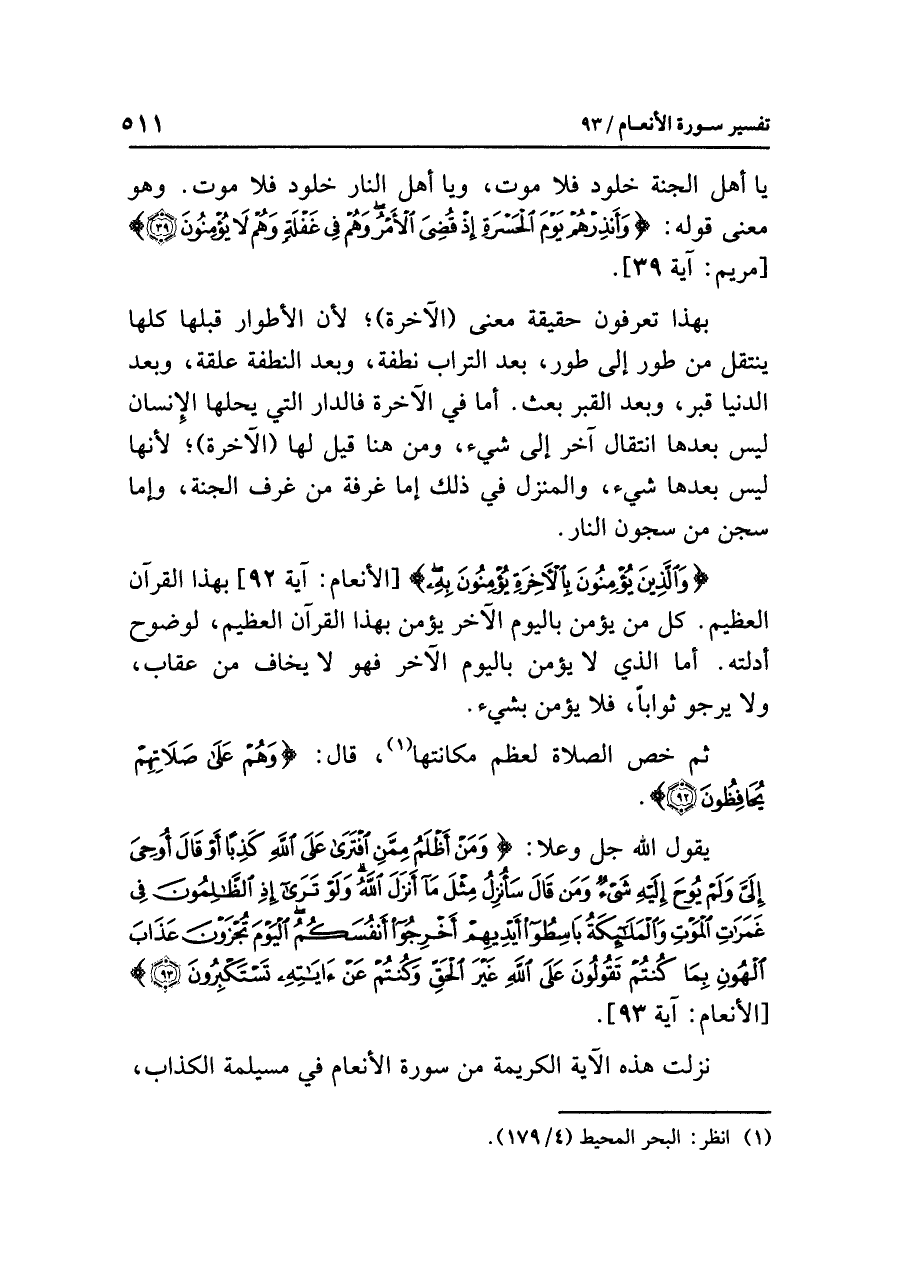{وَالَّذِينَ يُؤْمِنُونَ بِالآخِرَةِ يُؤْمِنُونَ بِهِ} [الأنعام: آية ٩٢] بهذا القرآنِ العظيمِ. كُلُّ مَنْ يُؤْمِنُ باليومِ الآخِرِ يُؤْمِنُ بهذا القرآنِ العظيمِ، لوضوحِ أَدِلَّتِهِ. أَمَّا الذي لَا يُؤْمِنُ باليومِ الآخِرِ فَهُوَ لَا يخافُ مِنْ عِقَابٍ، وَلَا يَرْجُو ثَوَابًا، فَلَا يُؤْمِنُ بِشَيْءٍ.
