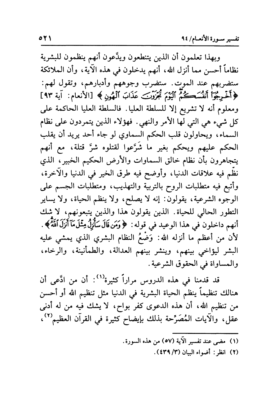 فهؤلاءِ الذين يَتَمَرَّدُونَ على نظامِ السماءِ، ويحاولونَ قَلْبَ الحكمِ السماويِّ لو جاءَ أحدٌ يريدُ أن يَقْلِبَ الحكمَ عليهم ويحكمَ بغيرِ ما شَرَّعُوا لَقَتَلُوهُ شَرَّ قِتْلَةٍ، مع أنهم يتجاهرونَ بأن نظامَ خالقِ السماواتِ والأرضِ الحكيمِ الخبيرِ، الذي نَظَّمَ فيه علاقاتِ الدنيا، وَأَوْضَحَ فيه طُرُقَ الخيرِ في الدنيا والآخرةِ، وَأَتْبَعَ فيه متطلباتِ الروحِ بالتربيةِ والتهذيبِ، ومتطلباتِ الجسمِ على الوجوهِ الشرعيةِ، يقولونَ: إِنَّهُ لَا يَصْلُحُ، ولَا يُنَظِّمُ الحياةَ، ولا يسايرُ التطورَ الْحَالِيَّ للحياةِ. الذين يقولونَ هذا والذين يَتَّبِعُونَهُمْ، لَا شَكَّ أنهم دَاخِلُونَ في هذا الوعيدِ في قولِه: {وَمَنْ قَالَ سَأُنْزِلُ مِثْلَ مَا أَنَزلَ اللَّهُ}. لأَنَّ مِنْ أَعْظَمِ ما أنزلَه اللَّهُ: وَضْعُ النظامِ البشريِّ الذي يَمْشِي عليه البشرُ لِيُؤَاخِيَ بينهم، وينشرَ بينهم العدالةَ والطمأنينةَ والرخاءَ والمساواةَ في الحقوقِ الشرعيةِ.