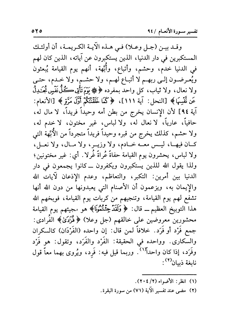 وقد بَيَّنَ (جل وعلا) في هذه الآيةِ الكريمةِ، أن أولئك الْمُسْتَكْبِرِينَ في دارِ الدنيا، الذين يستكبرونَ عَنْ آياتِه، الذين كان لَهُمْ في الدنيا خَدَمٌ وَحَشَمٌ وَأَتْبَاعٌ، وَأُبَّهَةٌ، أنهم يومَ القيامةِ يُبْعَثُونَ وَيُعْرَضُونَ إلى رَبِّهِمْ لَا أَتْبَاعَ لَهُمْ، ولَا حَشَمَ وَلَا خَدَمَ حتى وَلَا نِعَالَ وَلَا ثِيَابَ، كُلُّ وَاحِدٍ بِمُفْرَدِهِ: {يَوْمَ تَأْتِي كُلُّ نَفْسٍ تُجَادِلُ عَن نَّفْسِهَا} [النحل: آية ١١١] {كَمَا خَلَقْنَاكُمْ أَوَّلَ مَرَّةٍ} [الأنعام: آية ٩٤] لأَنَّ الإنسانَ يَخْرُجُ مِنْ بطنِ أُمِّهِ وحيدًا فريدًا، لَا مالَ لهُ حَافِيًا عَارِيًا لَا نِعَالَ لَهُ وَلَا لِبَاسَ، غَيْرُ مَخْتُونٍ، لَا خدمَ لَهُ، ولَا حَشَمَ، كذلك يخرجُ مِنْ قَبْرِهِ وحيدًا فريدًا متجردًا مِنَ الأُبَّهَةِ التي كَانَ فِيهَا، ليس معَه خادمٌ، ولا وزيرٌ، ولا مالٌ، ولا نعلٌ، ولا لباسٌ، يُحْشَرُونَ يومَ القيامةِ حفاةً عُراةً غُرْلاً. أي: غَيْرَ مَخْتُونِينَ؛ وَلِذَا يقولُ اللَّهُ لِلَّذِينَ يستكبرونَ ويكفرونَ - كانوا يَجْمَعُونَ في دارِ الدنيا بَيْنَ أَمْرَيْنِ: التكبرُ، والتعاظمُ، وعدمُ الإذعانِ لآياتِ اللَّهِ والإيمانِ به، ويزعمونَ أن الأصنامَ التي يَعْبُدُونَهَا مِنْ دُونِ اللَّهِ أَنَّهَا تشفعُ لهم يومَ القيامةِ، وَتُنَجِّيهِمْ من كرباتِ يومِ القيامةِ، فَوَبَّخَهُمُ اللَّهُ هذا التوبيخَ العظيمَ - قال: {وَلَقَدْ جِئْتُمُونَا} هُوَ مَجِيئُهُمْ يومَ القيامةِ مَحْشُورِينَ مَعْرُوضِينَ على خَالِقِهِمْ (جل وعلا) {فُرَادَى} الفُرَادَى: جَمْعُ فَرْدٍ أو فَرَدٍ. خلافًا لِمَنْ قال: إِنَّ وَاحِدَهُ (الفَرْدَان) كالسكرانِ والسكارى. وَوَاحِدُهُ في الحقيقةِ: الفَرْدُ والفَرَدُ، وتقولُ: هو فَرْدٌ وفَرَدٌ، إذا كان واحدًا (¬١). وَرُبَّمَا قيل فيه: فَرِدٌ، وَيُرْوَى بهما معًا قولُ نابغةِ ذبيانَ (¬٢):