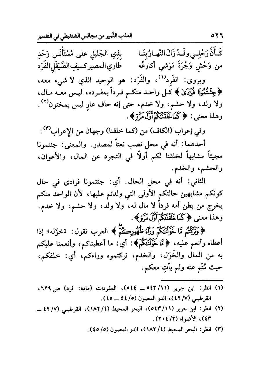 الثاني: أنه في مَحَلِّ الحالِ. أي: جِئْتُمُونَا فُرَادَى في حالِ كونِكم مُشَابِهِينَ حالتَكم الأُولَى التي وُلِدْتُمْ عليها؛ لأَنَّ الواحدَ منكم يخرجُ من بطنِ أُمِّهِ فَرْدًا لَا مالَ له، ولا ولدَ، ولا حشمَ ولا خدمَ. وهذا معنَى: {كَمَا خَلَقْنَاكُمْ أَوَّلَ مَرَّةٍ}.