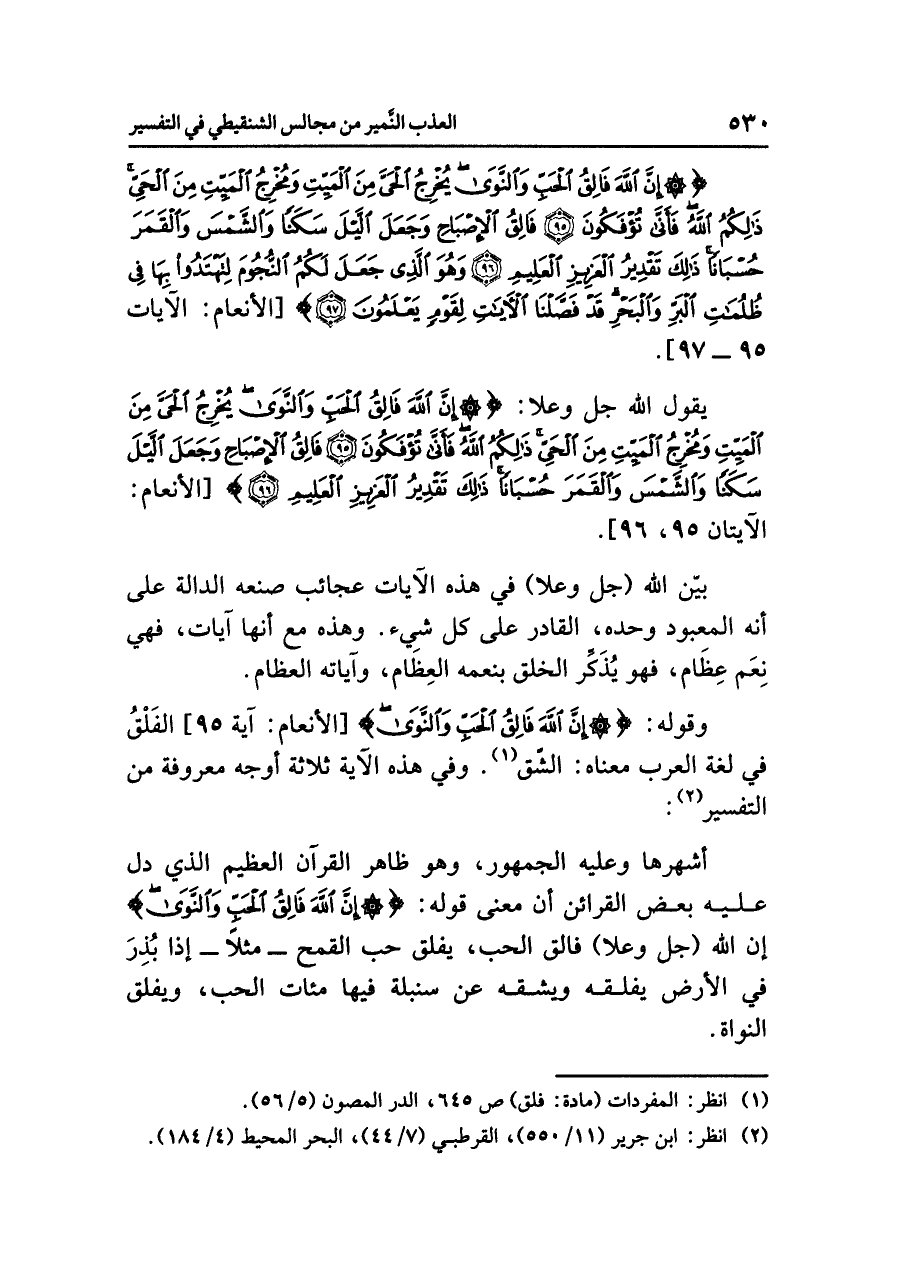 وقولُه: {إِنَّ اللَّهَ فَالِقُ الْحَبِّ وَالنَّوَى} [الأنعام: آية ٩٥] الفَلْقُ في لغةِ العربِ معناهُ: الشّقُّ (¬١). وفي هذه الآيةِ ثلاثةُ أَوْجُهٍ معروفة من التفسيرِ (¬٢):