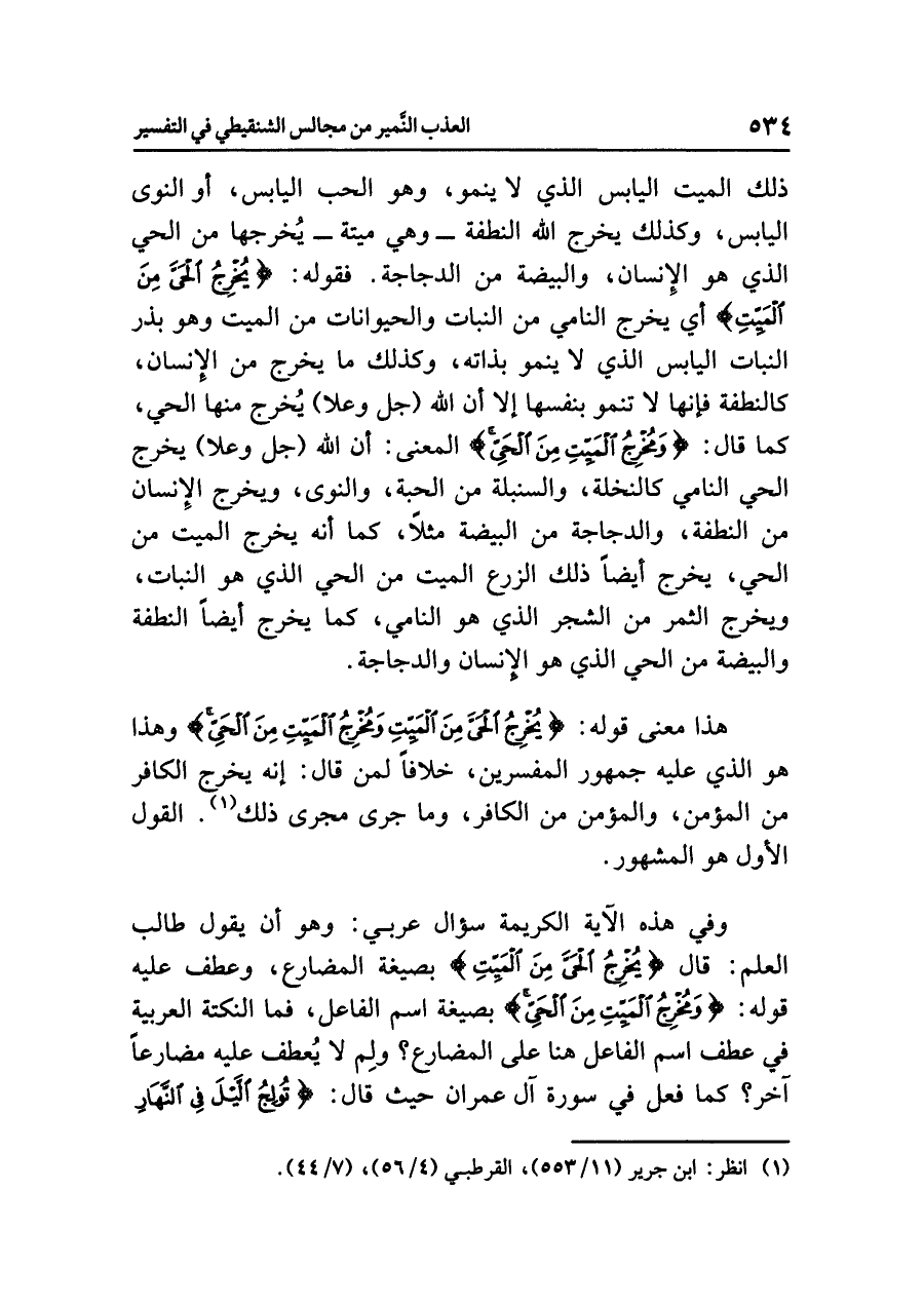 ذلك الميتِ اليابسِ الذي لَا يَنْمُو، وهو الْحَبُّ اليابسُ، أو النَّوَى اليابسُ، وكذلك يُخْرِجُ اللَّهُ النطفةَ - وهي ميتةٌ - يُخْرِجُهَا من الْحَيِّ الذي هو الإنسانُ، والبيضةَ من الدجاجةِ. فقولُه: {يُخْرِجُ الْحَيَّ مِنَ الْمَيِّتِ} أي يُخْرِجُ الناميَ من النباتِ والحيواناتِ من الميتِ وهو بِذْرُ النباتِ اليابسِ الذي لَا يَنْمُو بِذَاتِهِ، وكذلك ما يَخْرُجُ من الإنسانِ، كالنطفةِ فإنها لا تَنْمُو بنفسِها إلا أن اللَّهَ (جل وعلا) يُخْرِجُ منها الْحَيَّ، كما قال: {وَمُخْرِجُ الْمَيِّتِ مِنَ الْحَيِّ} المعنَى: أن اللَّهَ (جل وعلا) يُخْرِجُ الْحَيَّ الناميَ كالنخلةِ، والسنبلةَ من الحبةِ، والنَّوَى، ويخرجُ الإنسانَ من النطفةِ، والدجاجةَ من البيضةِ مثلاً، كما أنه يُخْرِجُ الميتَ من الحيِّ، يُخْرِجُ أيضًا ذلك الزرعَ الميتَ من الحيِّ الذي هو النباتُ، ويخرجُ الثمرَ من الشجرِ الذي هو النَّامِي، كما يُخْرِجُ أيضًا النطفةَ والبيضةَ من الحيِّ الذي هو الإنسانُ والدجاجةُ.