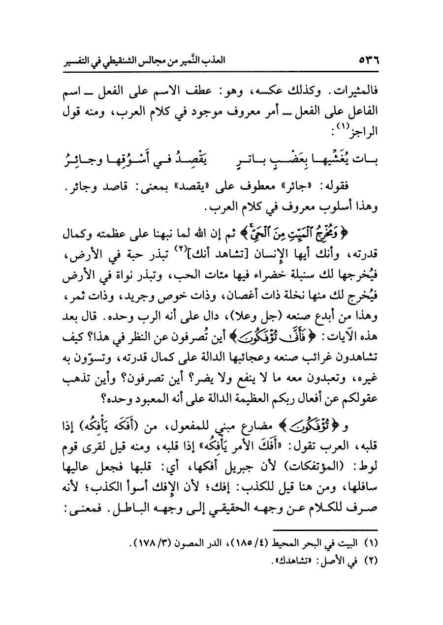 فالمثيرات. وكذلك عَكْسُهُ، وهو: عطفُ الاسمِ على الفعلِ - اسمُ الفاعلِ على الفعلِ - أَمْرٌ معروفٌ موجودٌ في كلامِ العربِ، ومنه قولُ الراجزِ (¬١):