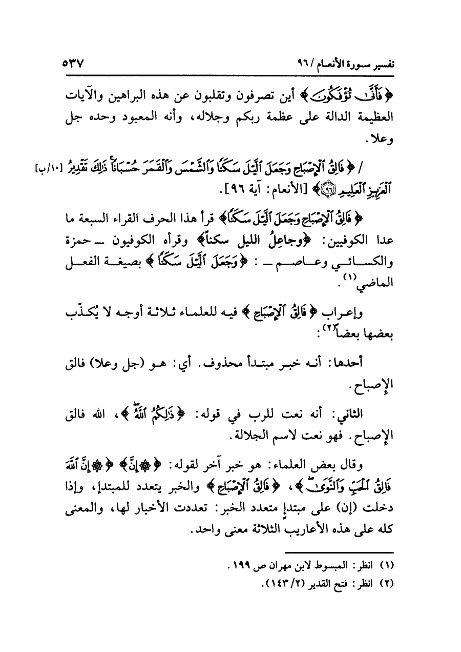 وإعرابُ {فَالِقُ الإِصْبَاحِ} فيه للعلماءِ ثلاثةُ أوجهٍ لَا يُكَذِّبُ بعضُها بَعْضًا (¬٢):