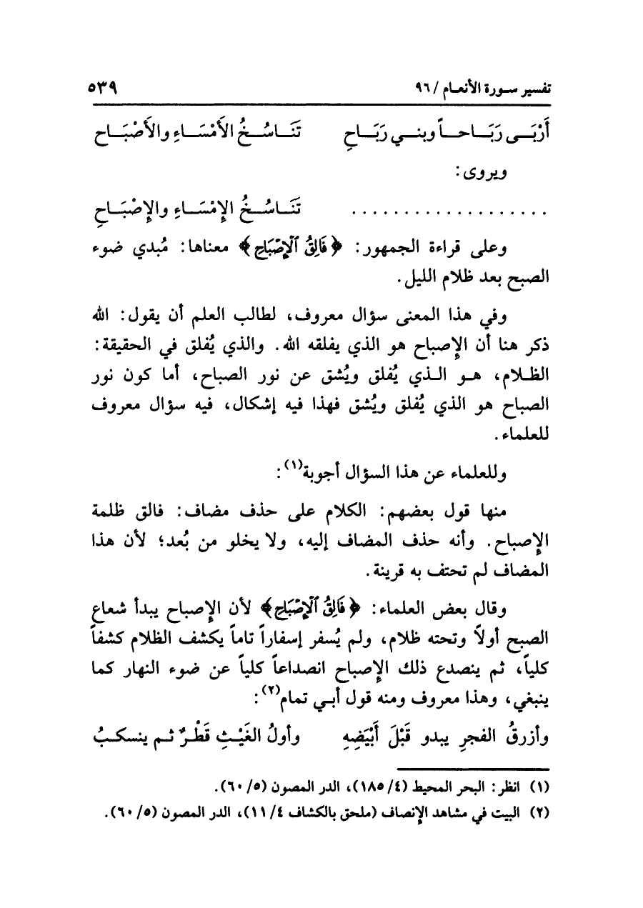منها قولُ بعضِهم: الكلامُ على حذفِ مُضَافٍ: فالقُ ظلمةِ الإصباحِ. وأنه حَذَفَ المضافَ إليه، ولا يَخْلُو مِنْ بُعْدٍ؛ لأَنَّ هذا المضافَ لَمْ تَحْتَفَّ بِهِ قَرِينَةٌ.