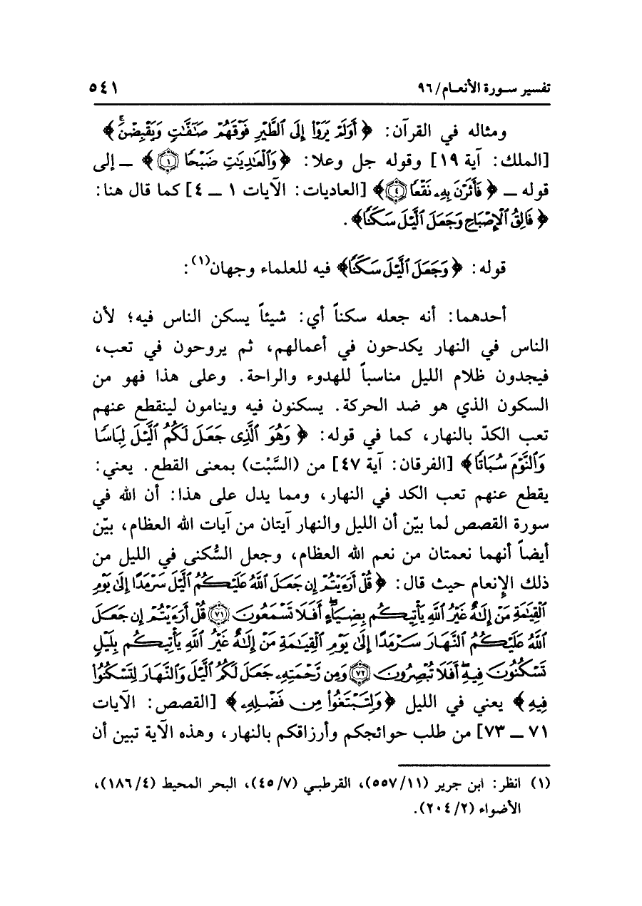 أحدُهما: أنه جَعَلَهُ سَكَنًا أي: شيئًا يسكنُ الناسُ فيه؛ لأَنَّ الناسَ في النهارِ يَكْدَحُونَ في أعمالِهم، ثم يَرُوحُونَ في تَعَبٍ، فيجدونَ ظلامَ الليلِ مناسبًا للهدوءِ والراحةِ. وعلى هذا فهو من السكونِ الذي هو ضِدُّ الحركةِ. يَسْكُنُونَ فيه وينامونَ لينقطعَ عنهم تعبُ الكدَّ بالنهارِ، كما في قولِه: {وَهُوَ الَّذِي جَعَلَ لَكُمُ اللَّيْلَ لِبَاسًا وَالنَّوْمَ سُبَاتًا} [الفرقان: آية ٤٧] من (السَّبْتِ) بمعنَى القطعِ. يعني: يقطعُ عنهم تعبَ الكدِّ في النهارِ، وَمِمَّا يدلُّ على هذا: أن اللَّهَ في سورةِ القصصِ لَمَّا بَيَّنَ أن الليلَ والنهارَ آيتانِ من آياتِ اللَّهِ العظامِ، بَيَّنَ أيضًا أنهما نعمتانِ من نِعَمِ اللَّهِ العظامِ، وَجَعَلَ السُّكْنَى في الليلِ من ذلك الإنعامِ حيث قال: {قُلْ أَرَأَيْتُمْ إِنْ جَعَلَ اللَّهُ عَلَيْكُمُ اللَّيْلَ سَرْمَدًا إِلَى يَوْمِ الْقِيَامَةِ مَنْ إِلَهٌ غَيْرُ اللَّهِ يَأْتِيكُمْ بِضِيَاءٍ أَفَلَا تَسْمَعُونَ (٧١) قُلْ أَرَأَيْتُمْ إِنْ جَعَلَ اللَّهُ عَلَيْكُمُ النَّهَارَ سَرْمَدًا إِلَى يَوْمِ الْقِيَامَةِ مَنْ إِلَهٌ غَيْرُ اللَّهِ يَأْتِيكُمْ بِلَيْلٍ تَسْكُنُونَ فِيهِ أَفَلَا تُبْصِرُونَ (٧٢) وَمِنْ رَحْمَتِهِ جَعَلَ لَكُمُ اللَّيْلَ وَالنَّهَارَ لِتَسْكُنُوا فِيهِ} يعني في الليلِ {وَلِتَبْتَغُوا مِنْ فَضْلِهِ} [القصص: الآيات ٧١ - ٧٣] مِنْ طَلَبِ حوائجِكم وأرزاقِكم بالنهارِ، وهذه الآيةُ تُبَيِّنُ أن
