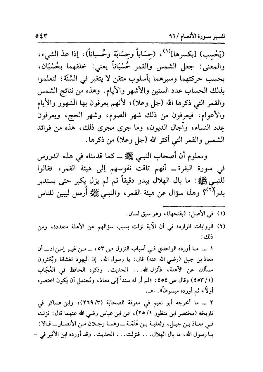 (يَحْسِب) [بكسرها] (¬١)، (حِسَابًا وحِسَابَةً وحُسبانًا)، إذا عَدَّ الشيء، والمعنَى: جَعَلَ الشمسَ والقمرَ حُسْبَانًا يعنِي: خَلَقَهُمَا بحُسْبَانٍ، يحسب حركتِهما وَسَيْرِهِمَا بأسلوبٍ مُتْقَنٍ لَا يتغيرُ في السَّنَةِ؛ لتعلموا بذلك الحسابِ عددَ السنين والأَشْهُرِ والأيامِ. وهذه من نتائجِ الشمسِ والقمرِ التي ذَكَرَهَا اللَّهُ (جل وعلا)؛ لأنهم يعرفونَ بها الشهورَ والأيامَ والأعوامَ، فيعرفونَ من ذلك شهرَ الصومِ، وشهرَ الحجِّ، ويعرفونَ عِدَدَ النساءِ، وآجالَ الديونِ، وما جَرَى مَجْرَى ذلك، هذه من فوائدِ الشمسِ والقمرِ التي أَكْثَرَ اللَّهُ (جل وعلا) مِنْ ذِكْرِهَا.