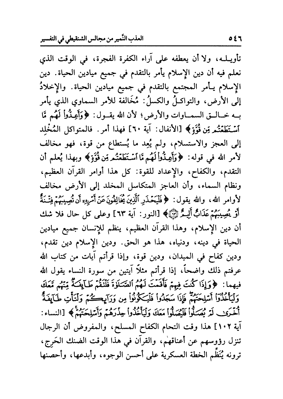 تأويلِه، وَلَا أَنْ يَعْطِفَهُ على آراءِ الكفرةِ الفجرةِ، في الوقتِ الذي نعلمُ فيه أن دينَ الإسلامِ يأمرُ بالتقدمِ في جميعِ ميادينِ الحياةِ. دِينُ الإسلامِ يَأْمُرُ المجتمعَ بالتقدمِ في جميعِ ميادينِ الحياةِ. والإخلادُ إلى الأرضِ والتواكلُ والكسلُ: مُخَالَفَةٌ للأمرِ السماويِّ الذي يَأْمُرُ به خالقُ السماواتِ والأرضِ، لأَنَّ اللَّهَ يقولُ: {وَأَعِدُّوا لَهُم مَّا اسْتَطَعْتُم مِّنْ قُوَّةٍ} [الأنفال: آية ٦٠] فهذا أَمْرٌ. فالمتواكلُ الْمُخْلِدُ إلى العجزِ والاستسلامِ، وَلَمْ يُعِدَّ مَا يُسْتَطَاعُ من قوةٍ، فهو مخالفٌ لأَمْرِ اللَّهِ في قولِه: {وَأَعِدُّوا لَهُم مَّا اسْتَطَعْتُم مِّن قُوَّةٍ} وبهذا يُعْلَمُ أن التقدمَ والكفاحَ والإعدادَ للقوةِ: كُلُّ هذا أوامرُ القرآنِ العظيمِ، ونظامُ السماءِ، وأن العاجزَ المتكاسلَ المخلدَ إلى الأرضِ مُخَالِفٌ لأوامرِ اللَّهِ، واللَّهُ يقولُ: {فَلْيَحْذَرِ الَّذِينَ يُخَالِفُونَ عَنْ أَمْرِهِ أَنْ تُصِيبَهُمْ فِتْنَةٌ أَوْ يُصِيبَهُمْ عَذَابٌ أَلِيمٌ} [النور: آية ٦٣] وعلى كُلِّ حَالٍ فَلَا شَكَّ أَنَّ دِينَ الإسلامِ، وهذا القرآنَ العظيمَ، يُنَظِّمُ للإنسانِ جميعَ ميادينِ الحياةِ في دِينِهِ وَدُنْيَاهُ، هذا هو الحقُّ.