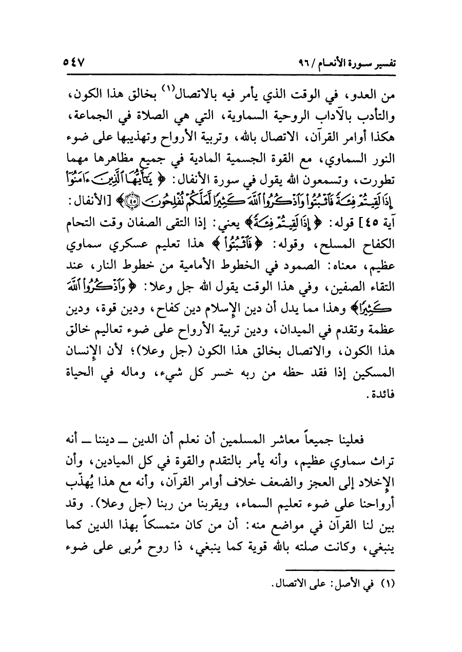الوقت الذي يَأْمُرُ فيه بالاتصالِ (¬١) بخالقِ هذا الكونِ، والتأدبِ بالآدابِ الروحيةِ السماويةِ، التي هي الصلاةُ في الجماعةِ، هكذا أوامرُ القرآنِ، الاتصالُ بالله، وتربيةُ الأرواحِ وتهذيبُها على ضوءِ النورِ السماويِّ، مع القوةِ الجسميةِ الماديةِ في جميعِ مظاهرِها مَهْمَا تَطَوَّرَتْ، وتسمعونَ اللَّهَ يقولُ في سورةِ الأنفالِ: {يَا أَيُّهَا الَّذِينَ آمَنُوا إِذَا لَقِيتُمْ فِئَةً فَاثْبُتُوا وَاذْكُرُوا اللَّهَ كَثِيرًا لَّعَلَّكُمْ تُفْلَحُونَ} [الأنفال: آية ٤٥] قولُه: {إِذَا لَقِيتُمْ فِئَةً} يعنِي: إذا الْتَقَى الصفانِ وقتَ التحامِ الكفاحِ المسلحِ، وقولُه: {فَاثْبُتُوا} هذا تعليمٌ عسكريٌّ سماويٌّ عظيمٌ، معناه: الصمودُ في الخطوطِ الأماميةِ من خطوطِ النارِ، عند التقاءِ الصَّفَّيْنِ، وفي هذا الوقتِ يقولُ اللَّهُ جل وعلا: {وَاذْكُرُوا اللَّهَ كَثِيرًا} وهذا مِمَّا يَدُلُّ أن دينَ الإسلامِ دينُ كفاحٍ، ودينُ قوةٍ، ودينُ عظمةٍ وَتَقَدُّمٍ في الميدانِ، ودينُ تربيةِ الأرواحِ على ضوءِ تعاليمِ خالقِ هذا الكونِ، والاتصالِ بخالقِ هذا الكونِ (جل وعلا)؛ لأَنَّ الإنسانَ المسكينَ إذا فَقَدَ حَظَّهُ من رَبِّهِ خَسِرَ كُلَّ شَيْءٍ، وَمَا لَهُ فِي الحياةِ فَائِدَةٌ.