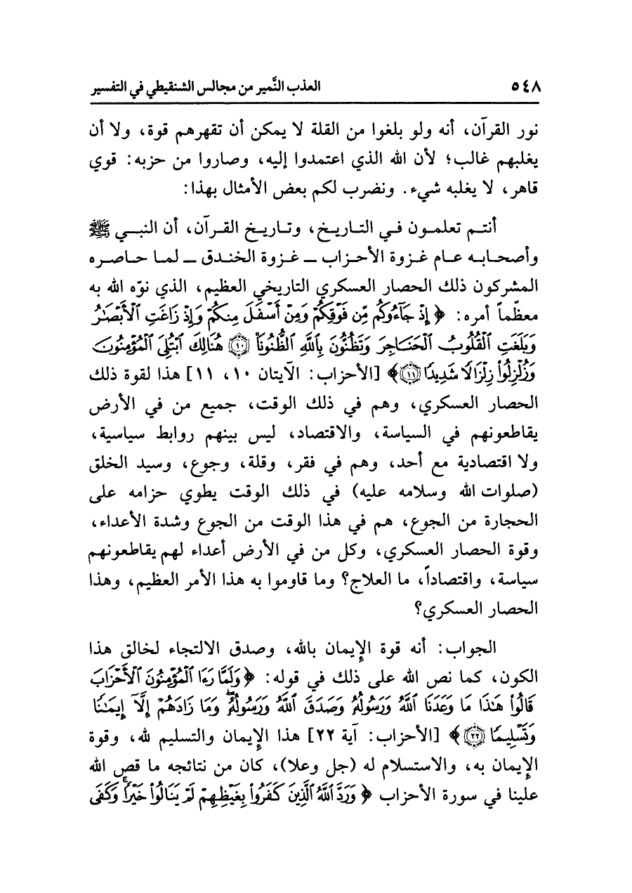 أنتم تعلمونَ في التاريخِ، وتاريخِ القرآنِ، أن النبيَّ - صلى الله عليه وسلم - وأصحابَه عام غزوةِ الأحزابِ - غزوةِ الخندقِ - لَمَّا حَاصَرَهُ المشركونَ ذلك الحصارَ العسكريَّ التاريخيَّ العظيمَ، الذي نَوَّهَ اللَّهُ به مُعَظِّمًا أَمْرَهُ: {إِذْ جَاؤُوكُم مِّنْ فَوْقِكُمْ وَمِنْ أَسْفَلَ مِنْكُمْ وَإِذْ زَاغَتِ الْأَبْصَارُ وَبَلَغَتِ الْقُلُوبُ الْحَنَاجِرَ وَتَظُنُّونَ بِاللَّهِ الظُّنُونَا (١٠) هُنَالِكَ ابْتُلِيَ الْمُؤْمِنُونَ وَزُلْزِلُوا زِلْزَالاً شَدِيدًا (١١)} [الأحزاب: الآيتان ١٠، ١١] هذا لقوةِ ذلك الحصارِ العسكريِّ، وهم في ذلك الوقتِ، جميعُ مَنْ فِي الأرضِ يُقَاطِعُونَهُمْ في السياسةِ، والاقتصادِ، ليس بينَهم رَوَابِطُ سياسيةٌ، ولَا اقتصاديةٌ مع أحدٍ، وهم في فَقْرٍ وَقِلَّةٍ وجوعٍ، وسيدُ الخلقِ (صلواتُ اللَّهِ وسلامُه عليه) فِي ذلك الوقتِ يَطْوِي حِزَامَهُ على الحجارةِ من الجوعِ، هُمْ في هذا الوقتِ من الجوعِ وشدةِ الأعداءِ، وقوةِ الحصارِ العسكريِّ، وَكُلُّ مَنْ في الأرضِ أعداءٌ لهم يُقَاطِعُونَهُمْ سِيَاسَةً، واقتصادًا، ما العلاجُ؟ وما قاوموا به هذا الأمرَ العظيمَ، وهذا الحصارَ العسكريَّ؟