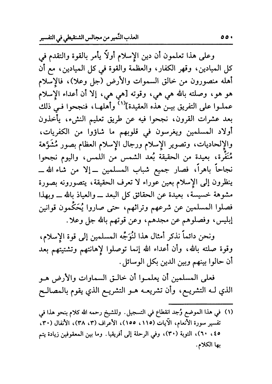 وعلى هذا تعلمونَ أن دينَ الإسلامِ أَوَّلاً يأمرُ بالقوةِ والتقدمِ في كُلِّ الميادينِ، وَقَهْرِ الكفارِ، والعظمةِ والقوةِ في كُلِّ الميادين، مع أن أهلَه منصورونَ من خالقِ السمواتِ والأرضِ (جل وعلا)، فالإسلامُ هُوَ هُوَ، وصلتُه بِاللَّهِ هِيَ هِيَ، وقوتُه [هِيَ هِيَ, إلا أن أعداءَ الإسلامِ عَمِلُوا على التفريقِ بين هذه العقيدةِ] (¬١) وأهلِها، فَنَجَحُوا في ذلك بعدَ عشراتِ القرونِ، نَجَحُوا فيه عن طريقِ تعليمِ النشءِ، يأخذونَ أولادَ المسلمين ويغرسونَ في قلوبِهم ما شَاؤُوا من الكفرياتِ والإلحادياتِ وتصويرِ الإسلامِ ورجالِ الإسلامِ العظامِ بصورٍ مُشوَّهةٍ مُنَفِّرَةٍ، بعيدةٍ من الحقيقةِ بُعْدَ الشمسِ من اللمسِ.
