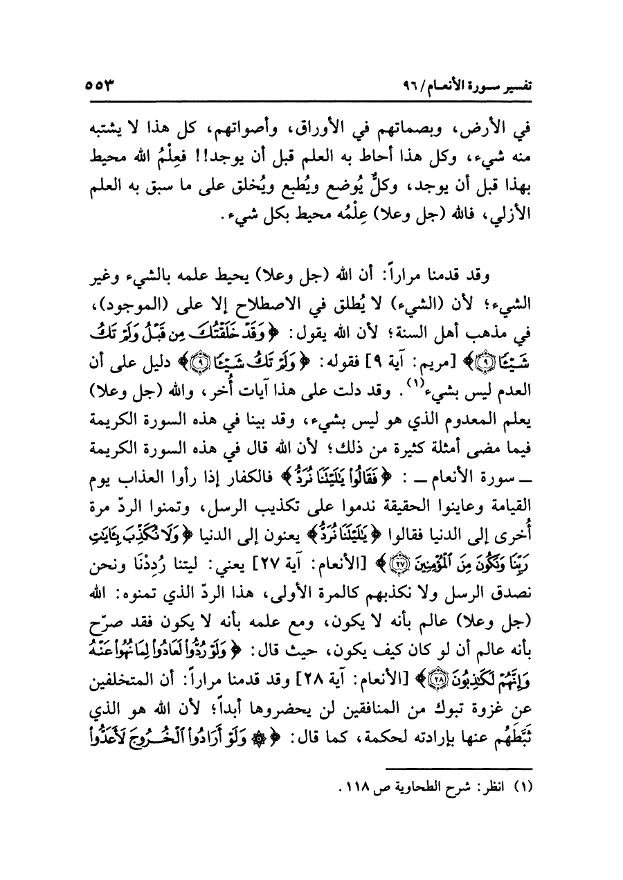 وقد قَدَّمْنَا مِرَارًا: أن اللَّهَ (جل وعلا) يحيطُ علمُه بالشيءِ وغيرِ الشيءِ؛ لأَنَّ (الشيءَ) لا يُطْلَقُ في الاصطلاحِ إلا عَلَى (الموجودِ)، في مذهبِ أهلِ السنةِ؛ لأَنَّ اللَّهَ يقولُ: {وَقَدْ خَلَقْتُكَ مِنْ قَبْلُ وَلَمْ تَكُ شَيْئًا} [مريم: آية ٩] فقولُه: {وَلَمْ تَكُ شَيْئًا} دليلٌ على أن العدمَ ليسَ بشيءٍ (¬١). وقد دَلَّتْ على هذا آياتٌ أُخَرُ، وَاللَّهُ (جل وعلا) يعلمُ المعدومَ الذي هو ليسَ بشيءٍ، وقد بَيَّنَّا في هذه السورةِ الكريمةِ فيما مَضَى أمثلةً كثيرةً من ذلك؛ لأَنَّ اللَّهَ قال في هذه السورةِ الكريمةِ - سورةِ الأنعامِ -: {فَقَالُوا يَا لَيْتَنَا نُرَدُّ} فالكفارُ إِذَا رَأَوُا العذابَ يومَ القيامةِ وَعَايَنُوا الحقيقةَ نَدِمُوا على تكذيبِ الرسلِ، وَتَمَنَّوُا الردَّ مرةً أُخْرَى إلى الدنيا فقالوا {يَا لَيْتَنَا نُرَدُّ} يَعْنُونَ إلى الدنيا: {وَلَا نُكَذِّبَ بِآيَاتِ رَبِّنَا وَنَكُونَ مِنَ الْمُؤْمِنِينَ} [الأنعام: آية ٢٧] يعني: لَيْتَنَا رُدِدْنَا ونحنُ نصدقُ الرسلَ ولَا نُكَذِّبَهُمْ كالمرةِ الأُولَى.