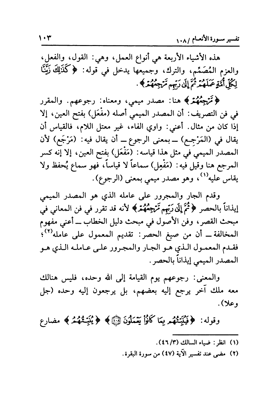 وَقَدَّمَ الجارَّ والمجرورَ على عاملِه الذي هو المصدرُ الميميُّ إِيذَانًا بالحصرِ: {ثُمَّ إِلَى رَبِّهِم مَّرْجِعُهُمْ} لأنه قد تَقَرَّرَ في فَنِّ المعانِي في مبحثِ القصرِ، وفنِّ الأصولِ في مبحثِ دليلِ الخطابِ - أعنِي مفهومَ المخالفةِ - أن مِنْ صِيَغِ الحصرِ: تقديمَ المعمولِ على عَامِلِهِ (¬٢)؛ فَقَدَّمَ المعمولَ الذي هو الجارُّ والمجرورُ على عاملِه الذي هو المصدرُ الميميّ إيذانًا بالحصرِ.