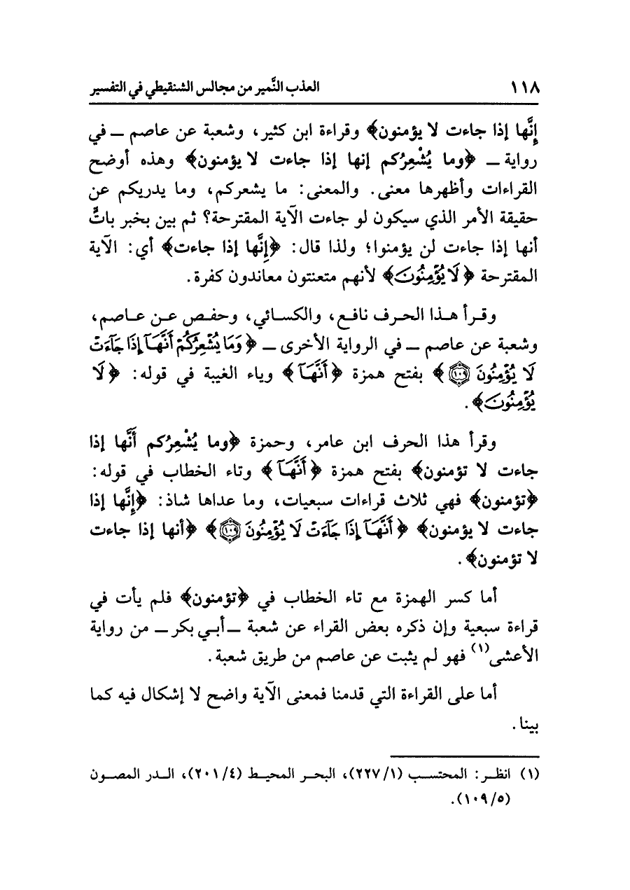 إِنها إذا جاءت لا يؤمنون} وقراءة ابنِ كثيرٍ وشعبةَ عن عاصمٍ - في روايةٍ - {وَمَا يُشْعِرُكم إنها إذا جاءت لا يؤمنون} وهذه أوضحُ القراءاتِ وأظهرُها معنًى. والمعنَى: ما يشعركم، وما يدريكم عن حقيقةِ الأمرِ الذي سيكونُ لو جاءت الآيةُ المقترحةُ؟ ثم بَيَّنَ بخبرٍ بَاتٍّ أنها إذا جاءت لَنْ يؤمنوا؛ ولذا قال: {إنَّها إذا جاءت} أي: الآيةُ المقترحةُ: {لَا يُؤْمِنُونَ} لأنهم مُتَعَنِّتُونَ مُعَانِدُونَ كَفَرَةٌ.
