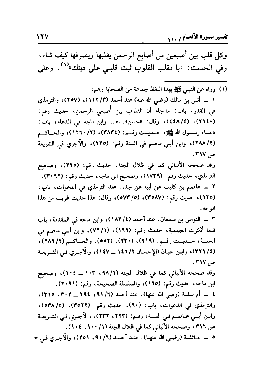 ١ - أنس بن مالك (رضي الله عنه) عند أحمد (٣/ ١١٢)، (٢٥٧)، والترمذي في القدر، باب: ما جاء أن القلوب بين أُصبعي الرحمن، حديث رقم (٢١٤٠)، (٤/ ٤٤٨)، وقال: «حسن» ا. هـ. وابن ماجه في الدعاء، باب: دعاء رسول الله - صلى الله عليه وسلم -. حديث رقم (٣٨٣٤)، (٢/ ١٢٦٠)، والحاكم (٢/ ٢٨٨)، وابن أبي عاصم في السنة رقم (٢٢٥)، والآجري في الشريعة ص ٣١٧.