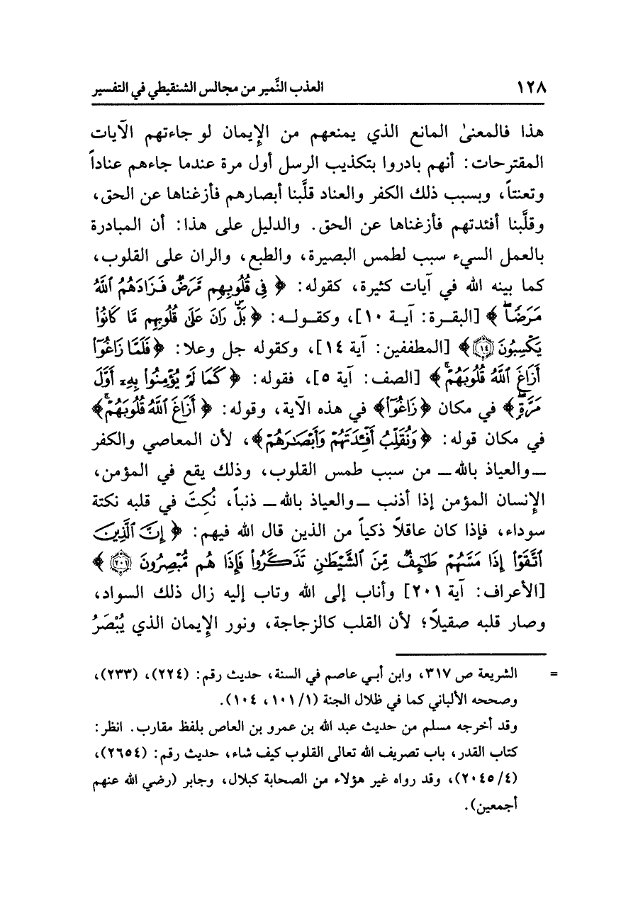 هذا فالمعنَى المانعُ الذي يَمْنَعُهُمْ من الإيمانِ لو جاءتهم الآياتُ المقترحاتُ: أنهم بَادَرُوا بتكذيبِ الرسلِ أولَ مرةٍ عندما جاءهم عِنَادًا وَتَعَنُّتًا، وبسببِ ذلك الكفرِ والعنادِ قَلَّبْنَا أبصارَهم فَأَزَغْنَاهَا عن الحقِّ، وَقَلَّبْنَا أفئدتَهم فَأَزَغْنَاهَا عن الحقِّ. والدليلُ على هذا: أن المبادرةَ بالعملِ السيءِ سببٌ لطمسِ البصيرةِ والطبعِ والرانِ على القلوبِ، كما بَيَّنَهُ اللَّهُ في آياتٍ كثيرةٍ، كقولِه: {فِي قُلُوبِهِم مَّرَضٌ فَزَادَهُمُ اللَّهُ مَرَضًا} [البقرة: آية ١٠] وكقوله: {بَلْ رَانَ عَلَى قُلُوبِهِم مَّا كَانُوا يَكْسِبُونَ} [المطففين: آية ١٤] وكقولِه جل وعلا: {فَلَمَّا زَاغُوا أَزَاغَ اللَّهُ قُلُوبَهُمْ} [الصف: آية ٥] فقولُه: {كَمَا لَمْ يُؤْمِنُوا بِهِ أَوَّلَ مَرَّةٍ} فِي مكانِ {زَاغُوا} في هذه الآيةِ، وقولُه: {أَزَاغَ اللَّهُ قُلُوبَهُمْ} في مكانِ قولِه: {وَنُقَلِّبُ أَفْئِدَتَهُمْ وَأَبْصَارَهُمْ} لأن المعاصيَ والكفرَ - والعياذُ بالله - من سببِ طمسِ القلوبِ، وذلك يقعُ في المؤمنِ، الإنسانُ المؤمنُ إذا أَذْنَبَ - والعياذُ بالله - ذَنْبًا. نُكِتَ في قلبِه نكتةٌ سوداءُ، فإذا كان عَاقِلاً ذَكِيًّا من الذين قال اللَّهُ فيهم: {إِنَّ الَّذِينَ اتَّقَوا إِذَا مَسَّهُمْ طَائِفٌ مِّنَ الشَّيْطَانِ تَذَكَّرُوا فَإِذَا هُم مُّبْصِرُونَ (٢٠١)} [الأعراف: آية ٢٠١] وأنابَ إلى اللَّهِ وتابَ إليه زالَ ذلك السوادُ، وصارَ قلبُه صَقِيلاً؛ لأن القلبَ كالزجاجةِ، ونورُ الإيمانِ الذي يُبْصَرُ
