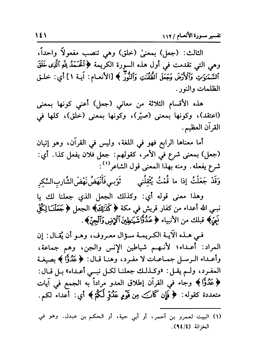 في هذه الآيةِ الكريمةِ سؤالٌ معروفٌ، وهو أن يُقالَ: إن المرادَ: أعداءٌ؛ لأنهم شياطينُ الإنسِ والجنِّ، وهم جماعةٌ، وأعداءُ الرسلِ جماعاتٌ لَا مفردٌ، وهنا قال: {عَدُوًّا} بصيغةِ المفردِ، ولم يَقُلْ: «وكذلك جعلنا لكل نبي أعداءً» بل قال: {عَدُوًّا} وجاءَ في القرآنِ إطلاقُ العدوِّ مُرَادًا به الجمعُ في آياتٍ متعددةٍ كقولِه: {فَإِنْ كَانَ مِنْ قَوْمٍ عَدُوٍّ لَّكُمْ} أي: أعداءٌ لكم.