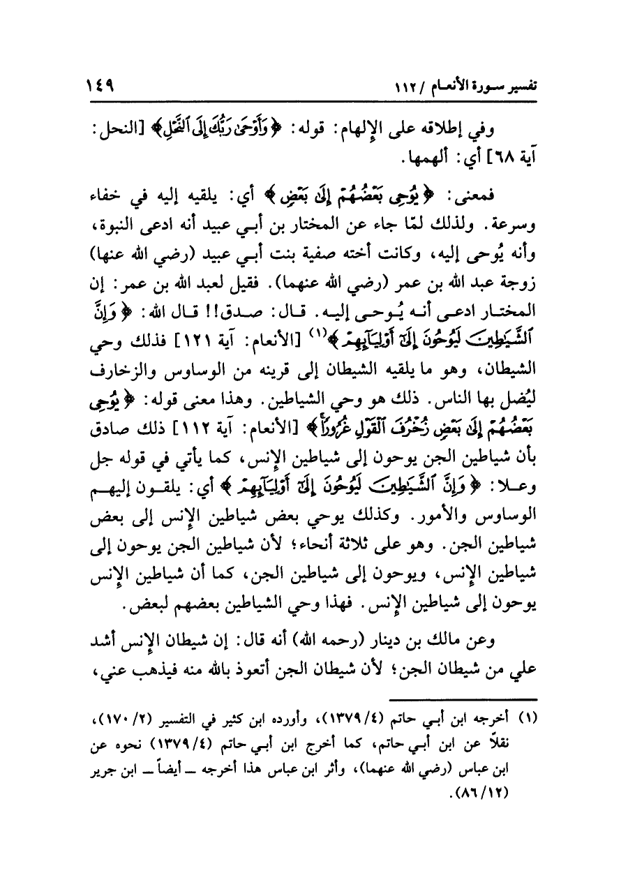 فمعنَى: {يُوحِي بَعْضُهُمْ إِلَى بَعْضٍ} أي: يُلْقِيهِ إليه في خفاءٍ وسرعةٍ. ولذلك لَمَّا جاء عن المختارِ بنِ أبي عبيدٍ أنه ادَّعَى النبوةَ، وأنه يُوحَى إليه، وكانت أختُه صفيةُ بنتُ أَبِي عبيدٍ (رضي الله عنها) زوجةَ عبدِ اللَّهِ بنِ عمرَ (رضي الله عنهما). فقيلَ لعبدِ اللَّهِ بنِ عمرَ: إن المختارَ ادَّعَى أنه يُوحَى إليه. قال: صَدَقَ!! قال اللَّهُ: {وَإِنَّ الشَّيَاطِينَ لَيُوحُونَ إِلَى أَولِيَائِهِمْ} (¬١) [الأنعام: آية ١٢١] فذلك وحيُ الشيطانِ، وهو ما يُلْقِيهِ الشيطانُ إلى قَرِينِهِ من الوساوسِ والزخارفِ لِيُضِلَّ بها الناسَ. ذلك هو وحيُ الشياطينِ. وهذا معنَى قولِه: {يُوحِي بَعْضُهُمْ إِلَى بَعْضٍ زُخْرُفَ الْقَوْلِ غُرُورًا} [الأنعام: آية ١١٢] ذلك صادقٌ بأن شياطينَ الجنِّ يُوحُونَ إلى شياطينِ الإنسِ، كما يأتي في قولِه جل وعلا: {وَإِنَّ الشَّيَاطِينَ لَيُوحُونَ إِلَى أَولِيَائِهِمْ} أي: يُلْقُونَ إليهم الوساوسَ والأمورَ. وكذلك يُوحِي بعضُ شياطينِ الإنسِ إلى بعضِ شياطينِ الجنِّ. وهو على ثلاثةِ أنحاءَ؛ لأن شياطينَ الجنِّ يوحونَ إلى شياطينِ الإنسِ، ويوحونَ إلى شياطينِ الجنِّ، كما أن شياطينَ الإنسِ يوحونَ إلى شياطينِ الإنسِ. فهذا وحيُ الشياطينِ بعضِهم لبعضٍ.