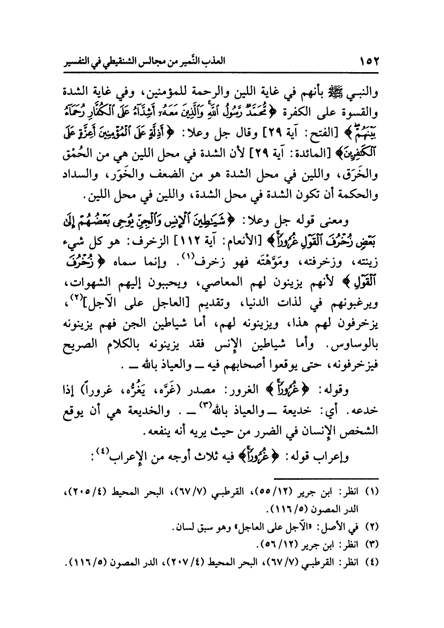 ومعنَى قولِه جل وعلا: {شَيَاطِينَ الإِنسِ وَالْجِنِّ يُوحِي بَعْضُهُمْ إِلَى بَعْضٍ زُخْرُفَ الْقَوْلِ غُرُورًا} [الأنعام: آية ١١٢] الزُّخْرُفُ: هو كُلُّ شيءٍ زَيَّنْتَهُ وَزَخْرَفْتَهُ وَمَوَّهْتَهُ فهو زُخْرُفٌ (¬١). وإنما سَمَّاهُ {زُخْرُفَ الْقَوْلِ}؛ لأنهم يُزَيِّنُونَ لهم المعاصيَ، ويحببونَ إليهم الشهواتِ، ويرغبونهم في لذاتِ الدنيا، وتقديمِ [العاجلِ على الآجلِ] (¬٢)، يزخرفونَ لهم هذا، ويزينونَه لهم، أما شياطينُ الجنِّ فَهُمْ يزينونَه بالوساوسِ. وأما شياطينُ الإنسِ فقد يُزَيِّنُونَهُ بالكلامِ الصريحِ فَيُزَخْرِفُونَهُ، حتى يوقعوا أصحابَهم فيه والعياذُ بالله.