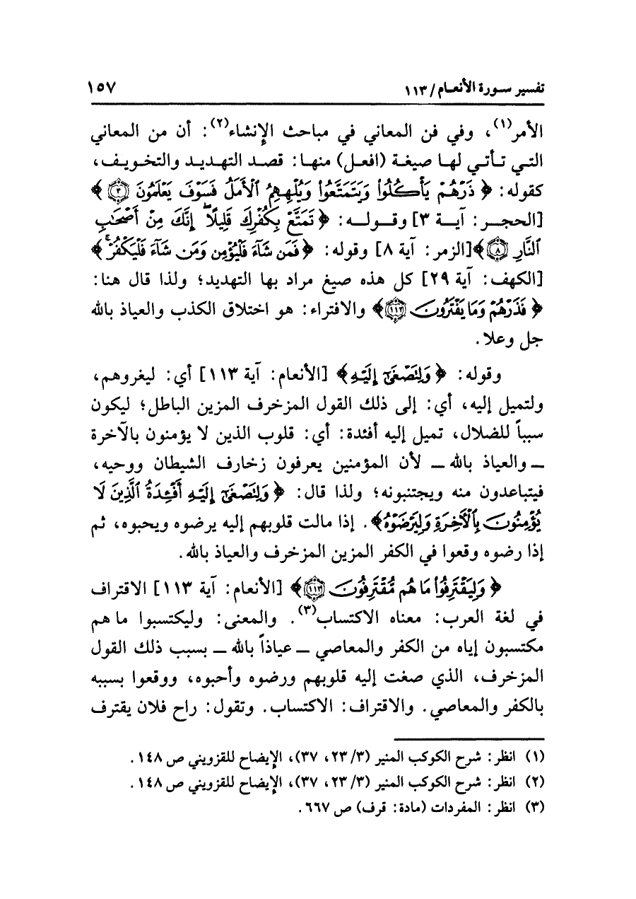{وَلِيَقْتَرِفُوا مَا هُم مُّقْتَرِفُونَ (١١٣)} [الأنعام: آية ١١٣] الاقترافُ في لغةِ العربِ: معناه الاكتسابُ (¬٣). والمعنَى: وَلِيَكْتَسِبُوا ما هم مكتسبونَ إياه من الكفرِ والمعاصِي - عياذًا بالله - بسببِ ذلك القولِ المزخرفِ، الذي صَغَتْ إليه قلوبُهم ورضوه وأحبوه، ووقعوا بسببِه بالكفرِ والمعاصِي. والاقترافُ: الاكتسابُ. وتقول: راحَ فلانٌ يقترفُ