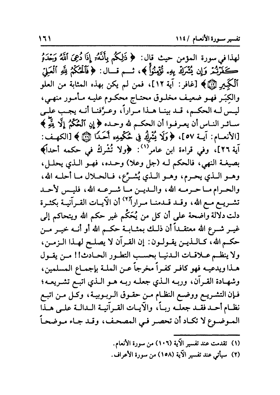 لهذا في سورةِ المؤمنِ حيث قالَ: {ذَلِكُمْ بِأَنَّهُ إِذَا دُعِىَ اللَّهُ وَحْدَهُ كَفَرْتُمْ وَإِنْ يُشْرَكْ بِهِ تُؤْمِنُوا}، ثم قال: {فَالْحُكْمُ لِلَّهِ الْعَلِىِّ الْكَبِيرِ} [غافر: آية ١٢]، فمن لم يكن بهذه المثابةِ مِنَ الْعُلُوِّ والكِبَرِ فهو ضعيفٌ مخلوقٌ محتاجٌ محكومٌ عليه مأمورٌ مَنْهِيٌّ، ليس له الحكمُ، قد بَيَّنَّا ذلك مرارًا، وَعَرَّفْنَا أنه يجبُ على سائرِ الناسِ أن يعرفوا أن الحكمَ لله وحدَه: {إِنِ الْحُكْمُ إِلَاّ لِلَّهِ} [الأنعام: آية ٥٧]، {وَلَا يُشْرِكُ فِي حُكْمِهِ أَحَدًا} [الكهف: آية ٢٦]، وفي قراءةِ ابنِ عامرٍ (¬١):