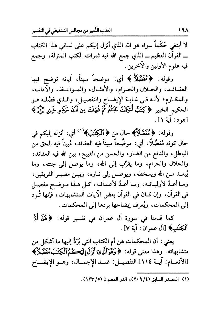 وقولُه: {مُفَصَّلاً} حالٌ مِنَ {الْكِتَابَ} (¬١) أي: أَنْزَلَهُ إليكم في حالِ كونِه مُفصَّلاً، أي: مُوَضَّحًا مُبَيَّنًا فيه العقائدُ، مُبَيَّنًا فيه الحقُّ من الباطلِ، والنافعُ من الضارِّ، والحسنُ من القبيحِ، بَيَّنَ اللَّهُ فيه العقائدَ، والحلالَ والحرامَ، وما يقرِّب إلى اللَّهِ، وما يُوَصِّلُ إلى جنتِه، وما يُبْعِدُ من اللَّهِ ويسخطُه، ويوصلُ إلى نارِه، وَبَيَّنَ مصيرَ الفريقين، وما أعدَّ لأوليائه، وما أعدَّ لأعدائِه، كُلُّ هذا مُوَضَّحٌ مُفَصَّلٌ في القرآنِ، وإن كان في القرآنِ بعضُ الآياتِ المتشابهاتِ، فإنها تُرَدُّ إلى الْمُحْكَمَاتِ، وَيُعْرَفُ إيضاحُها بِرَدِّهَا إلى المحكماتِ.