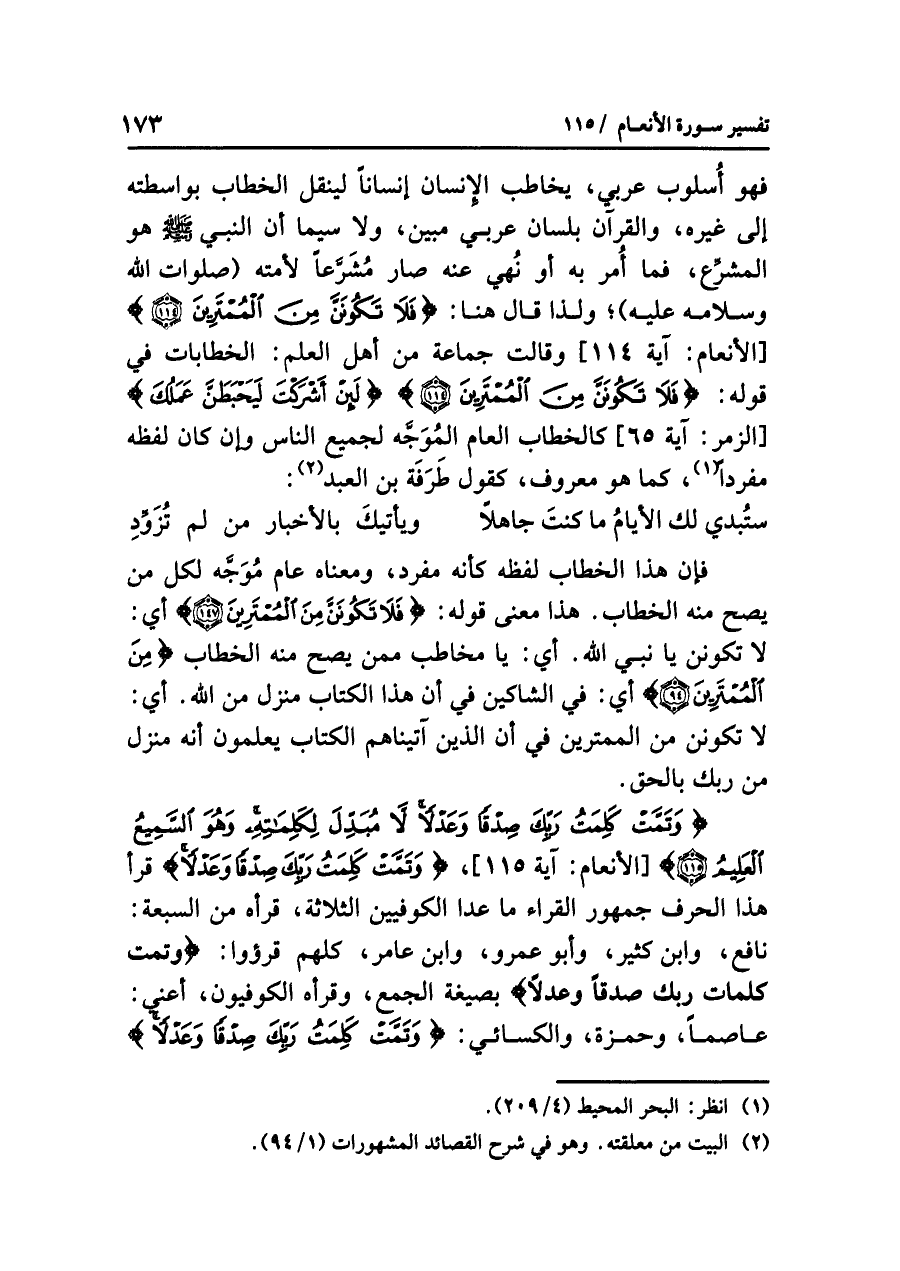 فهو أُسْلُوبٌ عَرَبِيٌّ، يخاطبُ الإنسانُ إِنْسَانًا لينقلَ الخطابَ بواسطتِه إلى غيرِه، والقرآنُ بلسانٍ عربيٍّ مبينٍ، ولا سيما أن النبيَّ - صلى الله عليه وسلم - هو الْمُشَرِّعُ، فَمَا أُمِرَ بِهِ أو نُهِيَ عنه صارَ مُشَرَّعًا لأُمَّتِهِ (صلواتُ الله وسلامُه عليه) ولذا قال هنا: {فَلَا تَكُونَنَّ مِنَ الْمُمْتَرِينَ} [الأنعام: آية ١١٤] وقالت جماعةٌ من أهلِ العلمِ: الخطاباتُ في قولِه: {فَلَا تَكُونَنَّ مِنَ الْمُمْتَرِينَ (١١٤)} {لَئِنْ أَشْرَكْتَ لَيَحْبَطَنَّ عَمَلُكَ} [الزمر: آية ٦٥] كالخطابِ العامِّ الْمُوَجَّهِ لجميعِ الناسِ وإن كان لفظُه مُفْرَدًا (¬١)، كما هو معروفٌ، كقولِ طَرَفَةَ بنِ العبدِ (¬٢):