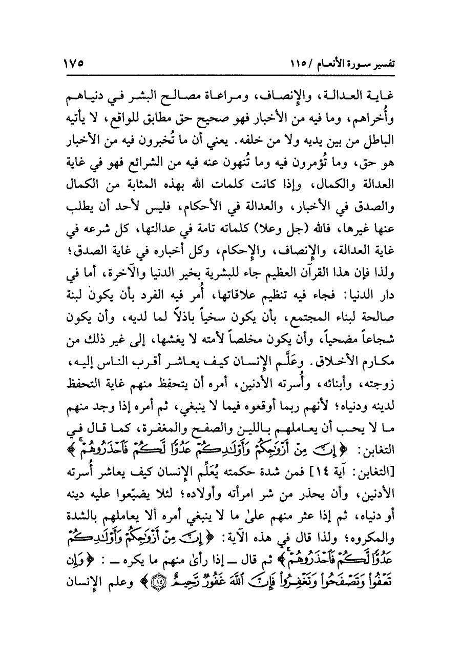 غايةِ العدالةِ والإنصافِ ومراعاةِ مصالحِ البشرِ في دُنْيَاهُمْ وَأُخْرَاهُمْ، وما فيه من الأخبارِ فهو صحيحٌ حَقٌّ مُطَابِقٌ للواقعِ، لا يأتيه الباطلُ من بَيْنِ يَدَيْهِ ولا من خَلْفِهِ. يعنِي أن ما تُخْبِرُونَ فيه من الأخبارِ هو حَقٌّ، وما تُؤْمَرُونَ فيه وما تُنْهَوْنَ عنه فيه من الشرائعِ فهو في غايةِ العدالةِ والكمالِ، وإذا كانت كلماتُ اللَّهِ بهذه المثابةِ من الكمالِ والصدقِ في الأخبارِ والعدالةِ في الأحكامِ فليس لأحدٍ أن يطلبَ عنها غيرَها، فَاللَّهُ (جل وعلا) كلماتُه تامةٌ في عدالتِها، كُلُّ شَرْعِهِ في غايةِ العدالةِ والإنصافِ والإحكامِ، وَكُلُّ أخبارِه في غايةِ الصدقِ؛ وَلِذَا فإن هذا القرآنَ العظيمَ جاء للبشريةِ بخيرِ الدنيا والآخرةِ، أما في دارِ الدنيا: فجاءَ فيه تنظيمُ علاقاتِها، أُمِرَ فيه الفردُ بأن يكونَ لَبِنَةً صالحةً لبناءِ المجتمعِ، بأن يكونَ سَخِيًّا باذلاً لِمَا لَدَيْهِ، وأن يكونَ شُجَاعًا مُضَحِّيًا، وأن يكونَ مُخْلِصًا لأُمَّتِهِ لا يغشها، إلى غيرِ ذلك من مكارمِ الأخلاقِ.