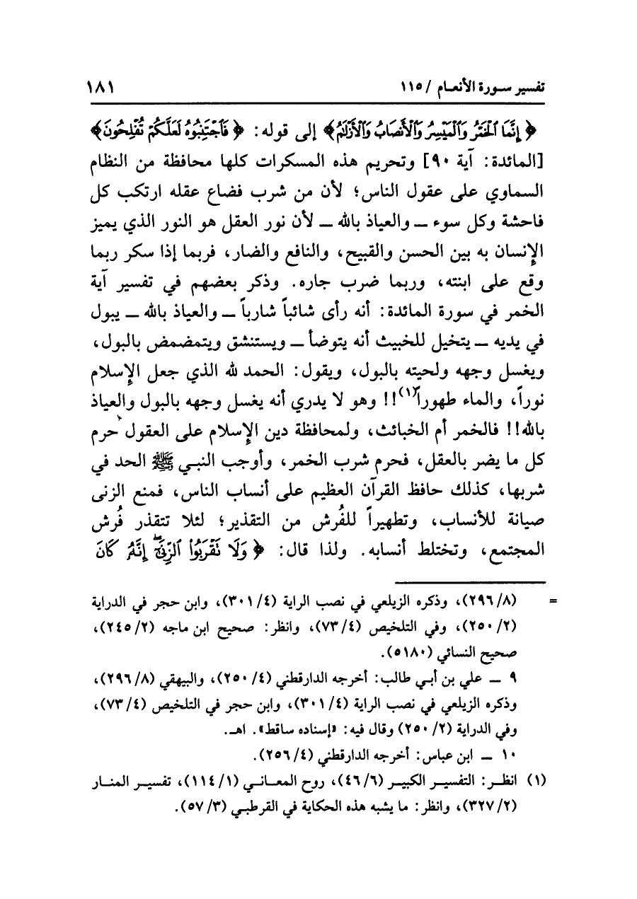 وَذَكَرَ بعضُهم في تفسيرِ آيةِ الخمرِ في سورةِ المائدةِ: أنه رَأَى شَائبًا شَارِبًا - والعياذُ بالله - يبولُ في يَدَيْهِ - يتخيلُ للخبيثِ أنه يَتَوَضَّأُ - ويستنشقُ ويتمضمضُ بالبولِ، ويغسلُ وجهَه ولحيتَه بالبولِ، ويقولُ: الحمدُ لله الذي جعلَ الإسلامَ نُورًا، والماءَ طَهُورًا (¬١)!! وهو لا يَدْرِي أنه يغسلُ وجهَه بالبولِ والعياذُ بالله!! فالخمرُ أُمُّ الخبائثِ، ولمحافظةِ دينِ الإسلامِ على العقولِ حَرَّمَ كُلَّ ما يضرُّ بالعقلِ، فَحَرَّمَ شربَ الخمرِ، وأوجبَ النبيُّ - صلى الله عليه وسلم - الحدَّ في شربِها، كذلك حافظَ القرآنُ العظيمُ على أنسابِ الناسِ، فَمَنَعَ الزِّنَى صيانةً للأنسابِ، وَتَطْهِيرًا لِلْفُرُشِ من التقذيرِ؛ لئلَاّ تتقذرَ فُرُشُ المجتمعِ، وتختلطَ أنسابُه؛ ولذا قال: {وَلَا تَقْرَبُوا الزِّنَى إِنَّهُ كَانَ