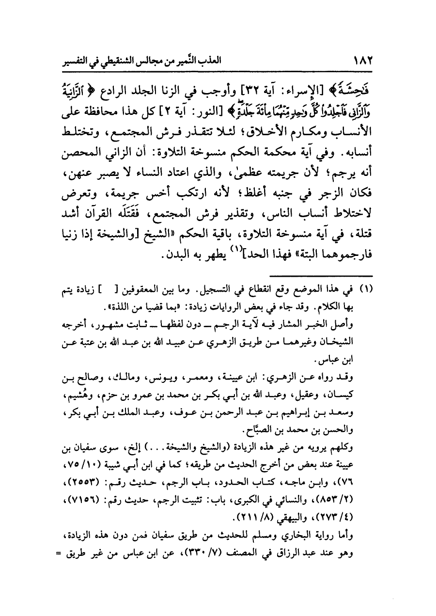 فَاحِشَةً} [الإسراء: آية ٣٢] وأوجبَ في الزنا الجلدَ الرادعَ: {الزَّانِيَةُ وَالزَّانِي فَاجْلِدُوا كُلَّ وَاحِدٍ مِّنْهُمَا مِئَةَ جَلْدَةٍ} [النور: آية ٢] كُلُّ هذا محافظةً على الأنسابِ ومكارمِ الأخلاقِ؛ لئلَاّ تتقذرَ فُرُشُ المجتمعِ، وتختلطَ أنسابُه. وفي آيةٍ مُحْكَمَةِ الحكمِ منسوخةِ التلاوةِ: أن الزانيَ المحصنَ أنه يُرْجَمُ؛ لأن جريمتَه عُظْمَى، والذي اعتادَ النساءَ لا يصبرُ عَنْهُنَّ، فكانَ الزجرُ في جنبِه أغلظَ؛ لأنه ارتكبَ أخسَّ جريمةً، وتعرضَ لاختلاطِ أنسابِ الناسِ، وتقذيرِ فرشِ المجتمعِ، فَقَتَلَهُ القرآنُ أشدَّ قِتْلَةٍ، في آيةٍ منسوخةِ التلاوةِ باقيةِ الحكمِ: «الشيخُ [والشيخةُ إذا زَنَيَا فَارْجُمُوهُمَا الْبَتَّةَ» فهذا الحدُّ] (¬١)