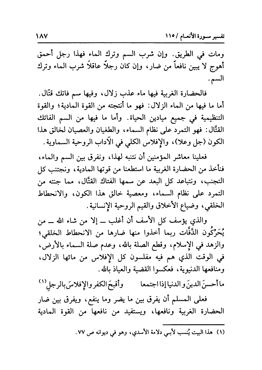 فالحضارةُ الغربيةُ فيها ماءٌ عذبٌ زُلَالٌ، وفيها سُمٌّ فَاتِكٌ قَتَّالٌ. أما ما فيها من الماءِ الزلالِ: فهو ما أَنْتَجَتْهُ من القوةِ الماديةِ؛ والقوةِ التنظيميةِ في جميعِ ميادينِ الحياةِ. وأما ما فيها من السمِّ الفاتكِ القتَّالِ: فهو التمردُ على نظامِ السماءِ، والطغيانُ والعصيانُ لخالقِ هذا الكونِ (جل وعلا)، والإفلاسُ الكليُّ في الآدابِ الروحيةِ السماويةِ.