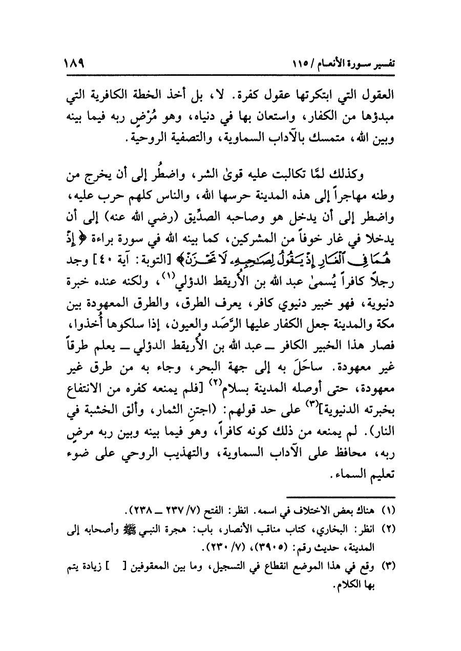 وكذلك لَمَّا تَكَالَبَتْ عليه قُوَى الشَّرِّ، وَاضْطُرَّ إلى أن يخرجَ من وطنِه مُهَاجِرًا إلى هذه المدينةِ حَرَسَهَا اللَّهُ، والناسُ كُلُّهُمْ حربٌ عليه، واضطر إلى أن يدخلَ هو وصاحبُه الصِّدِّيقُ (رضي الله عنه) إلى أن يدخلَا في غَارٍ خَوْفًا من المشركين، كما بينه اللَّهُ في سورةِ براءةِ: {إِذْ هُمَا فِي الْغَارِ إِذْ يَقُولُ لِصَاحِبِهِ لَا تَحْزَنْ} [التوبة: آية ٤٠] وَجَدَ رجلاً كافرًا يُسَمَّى عبدَ اللَّهِ بنَ الأُريقط الدؤلي (¬١)، ولكنه عندَه خبرةٌ دنيويةٌ، فهو خبيرٌ دنيويٌّ كافرٌ، يعرفُ الطرقَ، والطرقُ المعهودةُ بينَ مكةَ والمدينةِ جعلَ الكفارَ عليها الرَّصَدَ والعيونَ، إذا سَلَكُوهَا أخذوا، فصارَ هذا الخبيرُ الكافرُ- عبدُ اللَّهُ بنُ الأُريقط الدؤليُّ- يعلمُ طُرُقًا غيرَ معهودةٍ. سَاحَلَ به إلى جهةِ البحرِ، وجاء به من طرقٍ غيرِ معهودةٍ، حتى أَوْصَلَهُ المدينةَ بسلامٍ (¬٢) [فلم يَمْنَعْهُ كفرُه من الانتفاعِ بخبرتِه الدنيويةِ] (¬٣).