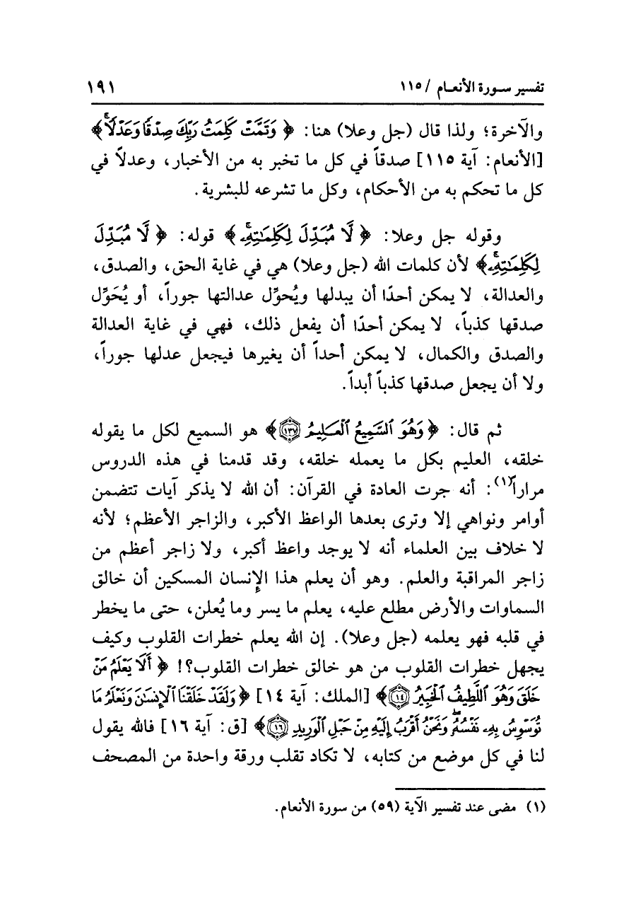 والآخرةِ؛ ولذا قال (جل وعلا) هنا: {وَتَمَّتْ كَلِمَتُ رَبِّكَ صِدْقًا وَعَدْلاً} [الأنعام: آية ١١٥] صدقًا في كُلِّ ما تُخْبِرُ به من الأخبارِ، وَعَدْلاً في كُلِّ ما تَحْكُمُ به من الأحكامِ، وكلِّ ما تُشَرِّعُهُ للبشريةِ.