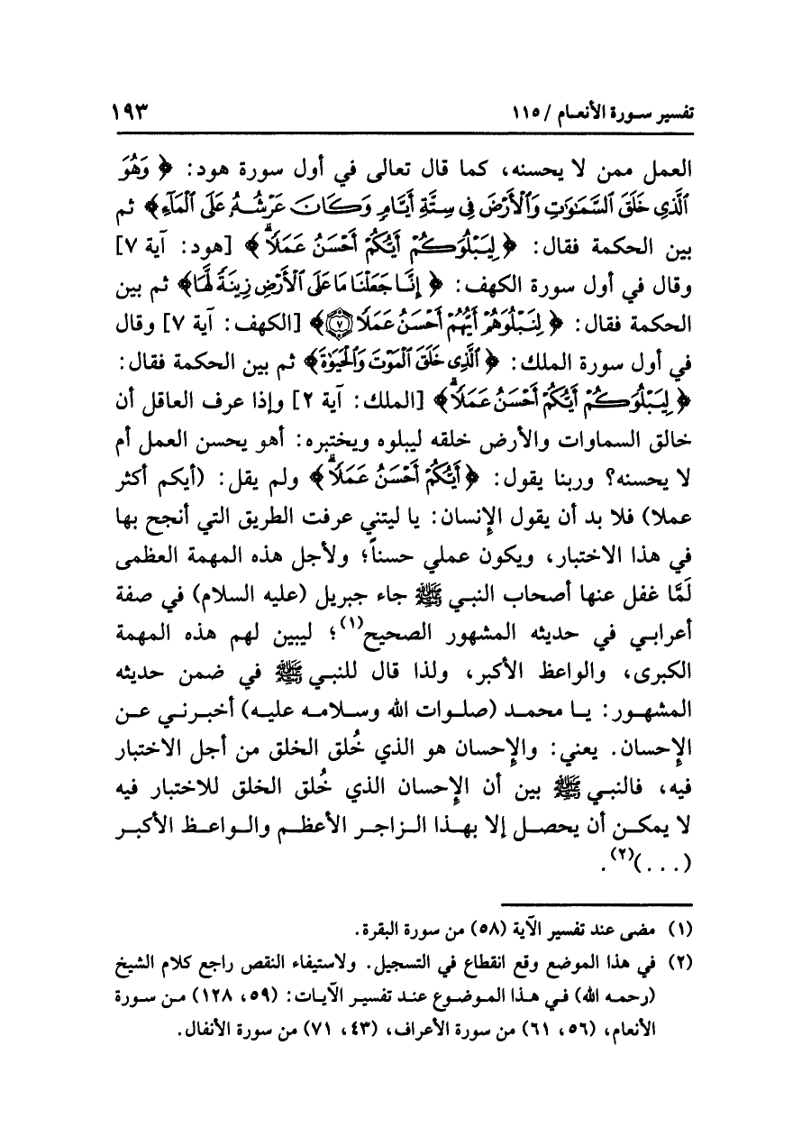 (¬٢) في هذا الموضع وقع انقطاع في التسجيل. ولاستيفاء النقص راجع كلام الشيخ (رحمه الله) في هذا الموضوع عند تفسير الآيات: (٥٩، ١٢٨) من سورة الأنعام، (٥٦، ٦١) من سورة الأعراف، (٤٣، ٧١) من سورة الأنفال.