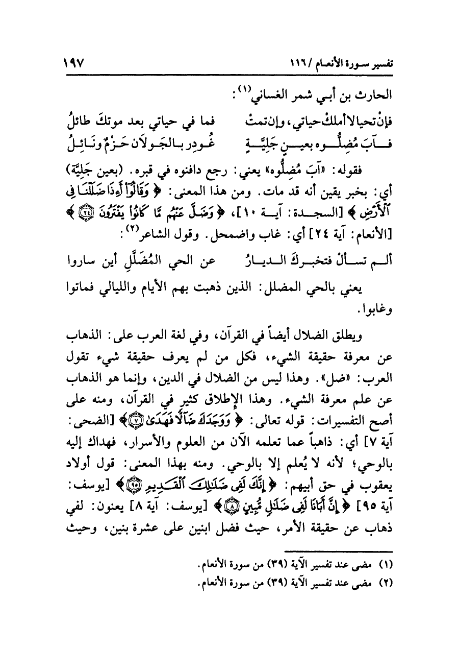ويطلقُ الضلالُ أيضًا في القرآنِ، وفي لغةِ العربِ على: الذهابِ عن معرفةِ حقيقةِ الشيءِ، فكلُّ مَنْ لَمْ يَعْرِفْ حقيقةَ شيءٍ تقولُ العربُ: «ضَلَّ». وهذا ليس من الضلالِ في الدينِ، وإنما هو الذهابُ عن علمِ معرفةِ الشيءِ. وهذا الإطلاقُ كثيرٌ في القرآنِ، ومنه على أَصَحِّ التفسيراتِ: قولُه تعالى: {وَوَجَدَكَ ضَالاًّ فَهَدَى (٧)} [الضحى: آية ٧] أي: ذَاهِبًا عما تَعْلَمُهُ الآنَ من العلومِ والأسرارِ، فهداكَ إليه بالوحيِ؛ لأنه لا يُعْلَمُ إلا بالوحيِ. ومنه بهذا المعنَى: قولُ أولادِ يعقوبَ في حَقِّ أَبِيهِمْ: {إِنَّكَ لَفِي ضَلَالِكَ الْقَدِيمِ (٩٥)} [يوسف: آية ٩٥] {إِنَّ أَبَانَا لَفِي ضَلَالٍ مُّبِينٍ (٨)} [يوسف: آية ٨] يعنونَ: لَفِي ذهابٍ عن حقيقةِ الأمرِ، حيث فَضَّلَ ابْنَيْنِ على عشرةِ بنينَ، وحيث