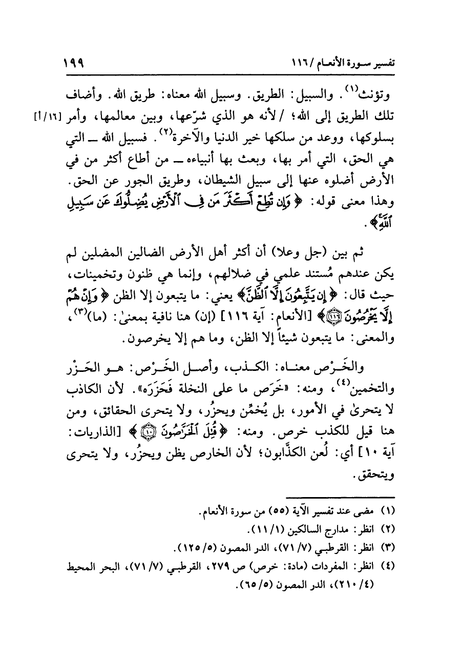 ثم بَيَّنَ (جل وعلا) أن أكثرَ أهلِ الأرضِ الضالينَ المضلينَ لَمْ يكن عندَهم مُسْتَنَدٌ عِلْمِيٌّ في ضلالِهم، وإنما هي ظُنُونٌ وتخميناتٌ، حيث قال: {إِنْ يَتَّبِعُونَ إِلَاّ الظَّنَّ} يعني: ما يَتَّبِعُونَ إلا الظنَّ {وَإِنْ هُمْ إِلَاّ يَخْرُصُونَ (١١٦)} [الأنعام: آية ١١٦] (إن) هنا نافيةٌ بمعنَى: (ما) (¬٣)، والمعنَى: ما يتبعونَ شَيْئًا إلا الظنَّ، وما هم إلا يَخْرُصُونَ.