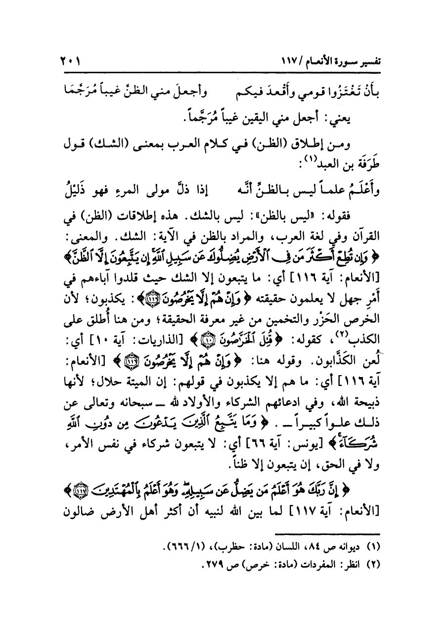 فقولُه: «ليس بالظنِّ»: ليس بالشكِّ. هذه إطلاقاتُ (الظنِّ) في القرآنِ وفي لغةِ العربِ، والمرادُ بالظنِّ في الآيةِ: الشكُّ. والمعنَى: {وَإِنْ تُطِعْ أَكْثَرَ مَنْ فِي الأَرْضِ يُضِلُّوكَ عَنْ سَبِيلِ اللَّهِ إِنْ يَتَّبِعُونَ إِلَاّ الظَّنَّ} [الأنعام: آية ١١٦] أي: ما يَتَّبِعُونَ إلا الشكَّ حيث قَلَّدُوا آباءَهم في أَمْرِ جهلٍ لا يعلمونَ حقيقتَه: {وَإِنْ هُمْ إِلَاّ يَخْرُصُونَ} يكذبون؛ لأن الخرصَ الحَزْرُ والتخمينُ من غيرِ معرفةِ الحقيقةِ، ومن هنا أُطْلِقَ على الكذبِ (¬٢)، كقولِه: {قُتِلَ الْخَرَّاصُونَ (١٠)} [الذاريات: آية ١٠] أي: لُعِنَ الكَذَّابون. وقولُه هنا: {وَإِنْ هُمْ إِلَاّ يَخْرُصُونَ} [الأنعام: آية ١١٦] أي: مَا هُمْ إلا يكذبونَ في قولِهم: إِنَّ الميتةَ حلالٌ؛ لأنها ذبيحةُ اللَّهِ، وفي ادعائِهم الشركاءَ والأولادَ لِلَّهِ - سبحانَه وتعالى عن ذلك عُلُوًّا كبيرًا- {وَمَا يَتَّبِعُ الَّذِينَ يَدْعُونَ مِنْ دُونِ اللَّهِ شُرَكَاءَ} [يونس: آية ٦٦] أي: لَا يتبعونَ شركاءَ في نفسِ الأمرِ، ولا في الحقِّ، إن يتبعونَ إلا ظَنًّا.