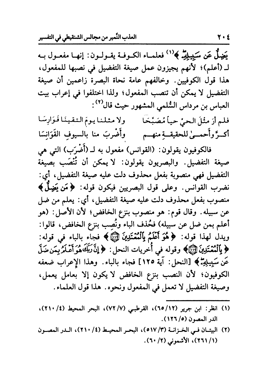 يَضِلُّ عَنْ سَبِيلِهِ} (¬١) فعلماءُ الكوفةِ يقولونَ: إنها مفعولٌ به لـ (أعلم)؛ لأنهم يُجِيزُونَ عملَ صيغةِ التفضيلِ في نَصْبِهَا للمفعولِ، هذا قولُ الكوفيين. وَخَالَفَهُمْ عامةُ نحاةِ البصرةِ زَاعِمِينَ أن صيغةَ التفضيلِ لا يمكنُ أن تنصبَ المفعولَ؛ ولذا اختلفوا في إعرابِ بيتِ العباسِ بنِ مرداسٍ السُّلميِّ المشهورِ حيث قال (¬٢):