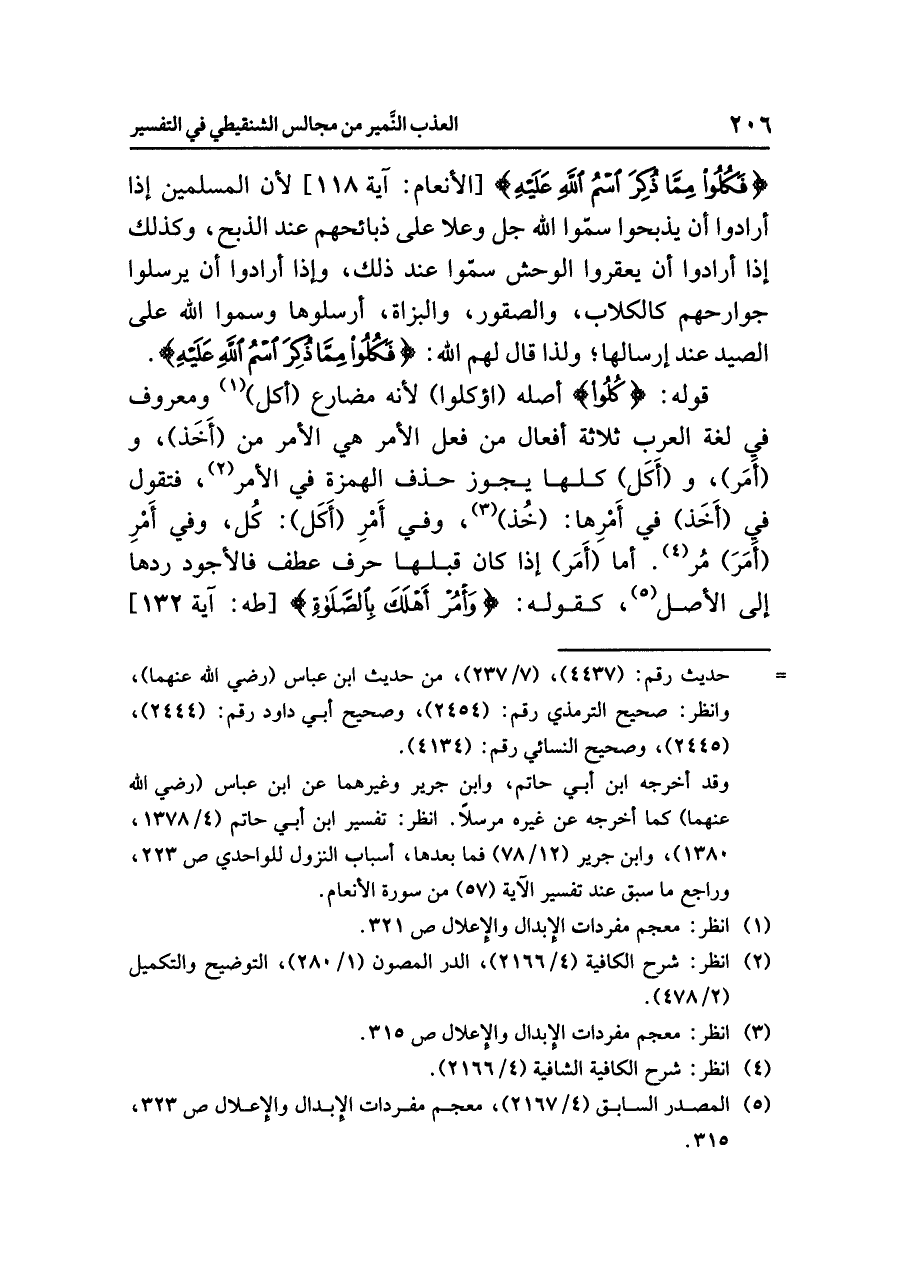 ومعروفٌ في لغةِ العربِ ثلاثةُ أفعالٍ من فعلِ الأمرِ هي الأمرُ من (أَخَذَ)، و (أَمَرَ)، و (أَكَلَ) كُلُّهَا يجوزُ حذفُ الهمزةِ في الأمرِ (¬٢)، فتقولُ في (أَخَذَ) في أَمْرِهَا: (خُذْ) (¬٣)، وفي أَمْرِ (أَكَلَ): كُلْ، وفي أَمْرِ (أَمَرَ) مُرْ (¬٤). أما (أَمَرَ) إذا كان قَبْلَهَا حرفُ عطفٍ فالأجودُ رَدُّهَا إلى الأصلِ (¬٥)، كقولِه: {وَأْمُرْ أَهْلَكَ بِالصَّلَاةِ} [طه: آية ١٣٢]
