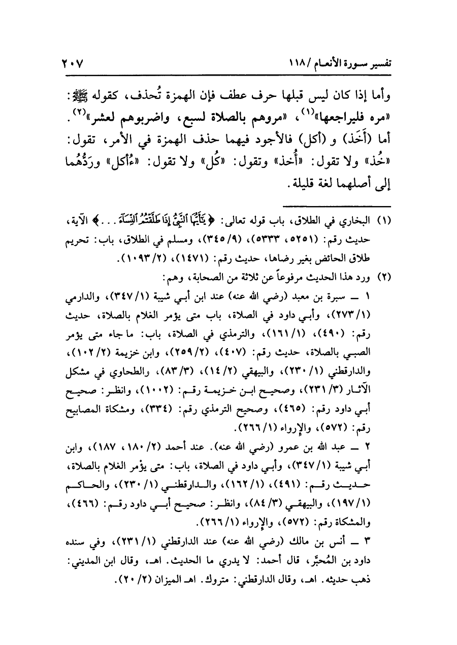 وأما إذا كان ليس قَبْلَهَا حرفُ عطفٍ فإن الهمزةَ تُحْذَفُ، كقولِه: «مُرْهُ فَلْيُرَاجِعْهَا» (¬١)، «مُرُوهُمْ بِالصَّلَاةِ لِسَبْعٍ، وَاضْرِبُوهُمْ لِعَشْرٍ» (¬٢).