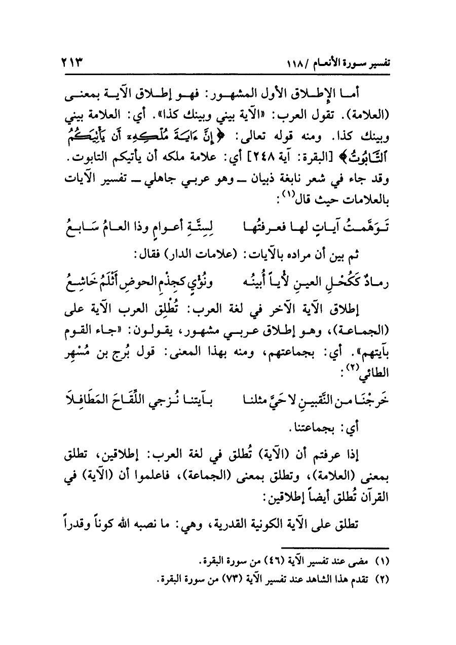 أما الإطلاقُ الأولُ المشهورُ: فهو إطلاقُ الآيةِ بمعنَى (العلامةِ). تقولُ العربُ: «الآيةُ بَيْنِي وبينَك كذا». أي: العلامةُ بَيْنِي وبينَك كذا. ومنه قولُه تعالى: {إِنَّ آيَةَ مُلْكِهِ أَنْ يَأْتِيَكُمُ التَّابُوتُ} [البقرة: آية ٢٤٨] أي: علامةُ مُلْكِهِ أن يأتيَكم التابوتُ. وقد جاءَ في شعرِ نابغةِ ذبيانَ- وهو عربيٌّ جاهليٌّ- تفسيرُ الآياتِ بالعلاماتِ حيث قال (¬١):