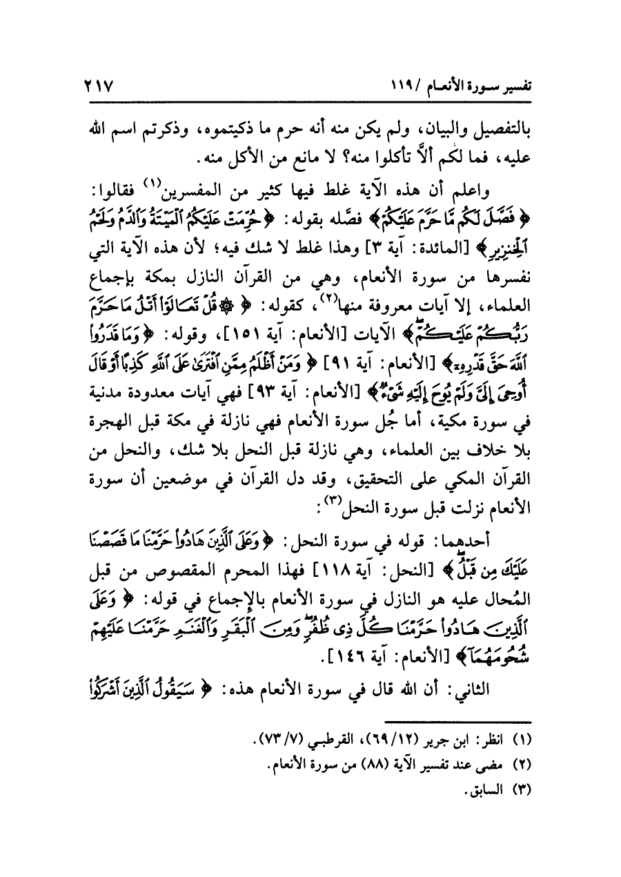وَاعْلَمْ أن هذه الآيةَ غَلِطَ فيها كثيرٌ من المفسرين (¬١) فقالوا: {فَصَّلَ لَكُم مَّا حَرَّمَ عَلَيْكُمْ} فصَّلَهُ بقولِه: {حُرِّمَتْ عَلَيْكُمُ الْمَيْتَةُ وَالْدَّمُ وَلَحْمُ الْخِنْزِيرِ} [المائدة: آية ٣] وهذا غلطٌ لا شكَّ فيه؛ لأن هذه الآيةَ التي نُفَسِّرُهَا من سورةِ الأنعامِ، وهي من القرآنِ النازلِ بمكةَ بإجماعِ علماء، إلا آياتٍ معروفةً منها (¬٢)، كقولِه: {قُلْ تَعَالَوْا أَتْلُ مَا حَرَّمَ رَبُّكُمْ عَلَيْكُمْ} الآياتِ [الأنعام: آية ١٥١]، وقوله: {وَمَا قَدَرُوا اللَّهَ حَقَّ قَدْرِهِ} [الأنعام: آية ٩١] {وَمَنْ أَظْلَمُ مِمَّنِ افْتَرَى عَلَى اللَّهِ كَذِبًا أَوْ قَالَ أُوحِيَ إِلَيَّ وَلَمْ يُوحَ إِلَيْهِ شَيْءٌ} [الأنعام: آية ٩٣] فهي آياتٌ معدودةٌ مدنيةٌ في سورةٍ مكيةٍ، أما جُلُّ سورةِ الأنعامِ فهي نازلةٌ في مكةَ قبلَ الهجرةِ بلا خلافٍ بين العلماءِ، وهي نازلةٌ قبلَ النحلِ بلا شكٍّ، والنحلُ من القرآنِ المكيِّ على التحقيقِ، وقد دَلَّ القرآنُ في مَوْضِعَيْنِ أن سورةَ الأنعامِ نَزَلَتْ قبلَ سورةِ النحلِ (¬٣):