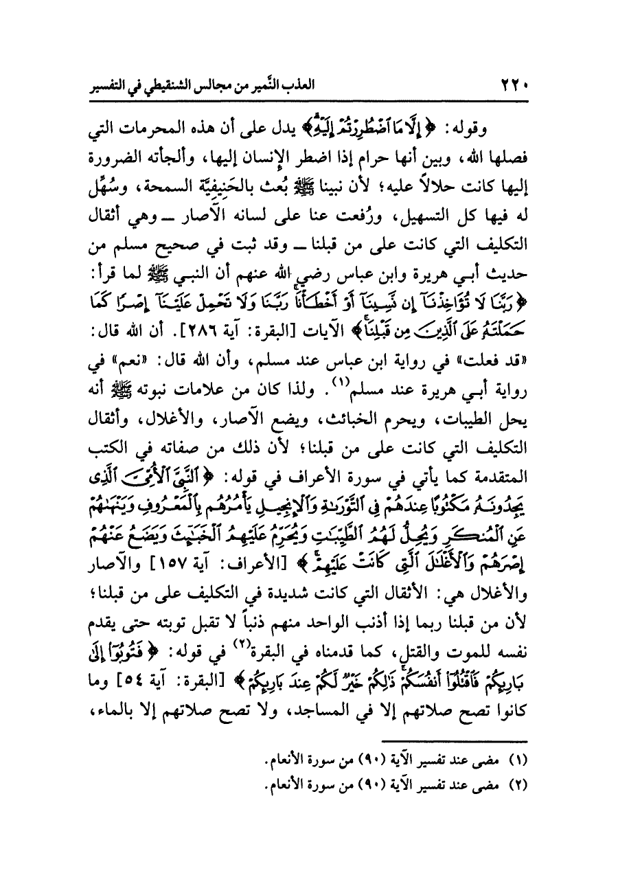 وقولُه: {إِلَاّ مَا اضْطُرِرْتُمْ إِلَيْهِ} يدلُّ على أن هذه المحرماتِ التي فَصَّلَهَا اللَّهُ، وَبَيَّنَ أنها حرامٌ إذا اضْطُرَّ الإنسانُ إليها وَأَلْجَأَتْهُ الضرورةُ إليها كانت حلالاً عليه؛ لأَنَّ نَبِيَّنَا - صلى الله عليه وسلم - بُعِثَ بالحَنِيفِيَّةِ السمحةِ، وسُهِّلَ له فيها كُلَّ التسهيلِ، وَرُفِعَتْ عنا على لسانِه الآصارُ- وهي أثقالُ التكليفِ التي كانت على مَنْ قَبْلَنَا- وقد ثَبَتَ في صحيحِ مسلمٍ من حديثِ أَبِي هريرةَ وابنِ عباسٍ رضي الله عنهم أن النبيَّ - صلى الله عليه وسلم - لَمَّا قَرَأَ: {رَبَّنَا لَا تُؤَاخِذْنَا إِن نَّسِينَا أَوْ أَخْطَأْنَا رَبَّنَا وَلَا تَحْمِلْ عَلَيْنَا إِصْرًا كَمَا حَمَلْتَهُ عَلَى الَّذِينَ مِنْ قَبْلِنَا} الآيات [البقرة: آية ٢٨٦]. أن اللَّهَ قال: «قَدْ فَعَلْتُ» في روايةِ ابنِ عباسٍ عند مسلمٍ، وأن اللَّهَ قال: «نَعَمْ» في روايةِ أبي هريرةَ عندَ مسلم (¬١). وَلِذَا كان من علاماتِ نُبَوَّتِهِ - صلى الله عليه وسلم - أنه يُحِلُّ الطيباتِ وَيُحَرِّمُ الخبائثَ ويضعُ الآصارَ والأغلالَ وأثقالَ التكليفِ التي كَانَتْ على مَنْ قَبْلَنَا؛ لأن ذلك من صفاتِه في الكتبِ المتقدمةِ كما يأتي في سورةِ الأعرافِ في قولِه: {النَّبِيَّ الأُمِّيَّ الَّذِي يَجِدُونَهُ مَكْتُوبًا عِنْدَهُمْ فِي التَّوْرَاةِ وَالإِنْجِيلِ يَأْمُرُهُمْ بِالْمَعْرُوفِ وَيَنْهَاهُمْ عَنِ الْمُنكَرِ وَيُحِلُّ لَهُمُ الطَّيِّبَاتِ وَيُحَرِّمُ عَلَيْهِمُ الْخَبَائِثَ وَيَضَعُ عَنْهُمْ إِصْرَهُمْ وَالأَغْلَالَ الَّتِي كَانَتْ عَلَيْهِمْ} [الأعراف: آية ١٥٧] والآصارُ والأغلالُ هي: الأثقالُ التي كانت شديدةً في التكليفِ على مَنْ قَبْلَنَا؛ لأن مَنْ قَبْلَنَا ربما إذا أَذْنَبَ الواحدُ منهم ذنبًا لا تُقْبَلُ توبتُه حتى يُقَدِّمَ نفسَه للموتِ والقتلِ، كما قَدَّمْنَاهُ في البقرةِ (¬٢)