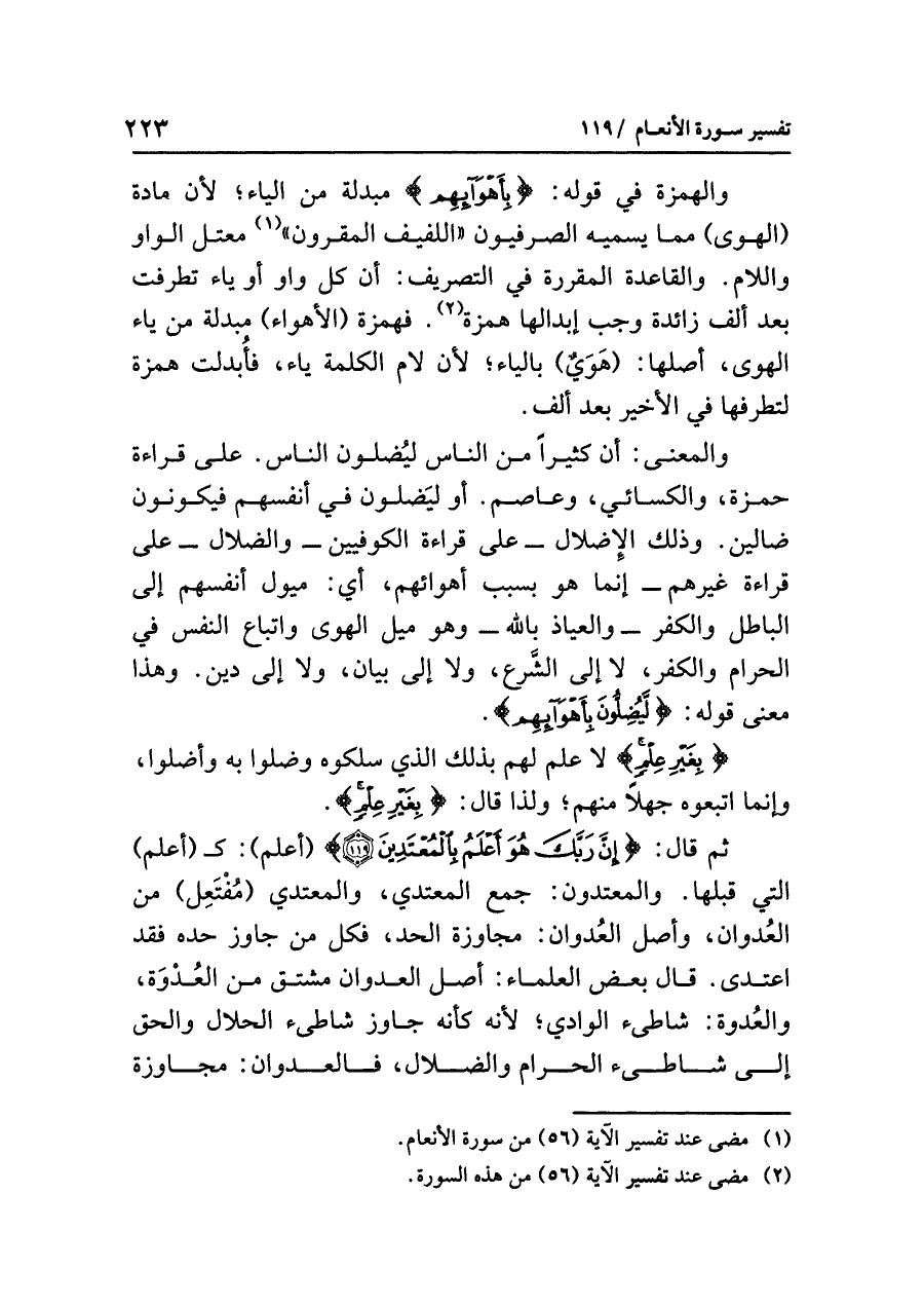 والمعنَى: أن كثيرًا من الناسِ ليُضلون الناسَ. على قراءةِ حمزةَ والكسائيِّ وعاصمٍ. أو ليَضلون في أنفسِهم فيكونونَ ضالينَ. وذلك الإضلالُ- على قراءةِ الكوفيين- والضلالُ- على قراءةِ غيرهم- إنما هو بسببِ أهوائِهم، أي: ميول أنفسِهم إلى الباطلِ والكفرِ- والعياذُ بالله- وهو ميلُ الهوى واتباعُ النفسِ في الحرامِ والكفرِ، لا إلى الشرعِ، ولا إلى بيانٍ، ولا إلى دِينٍ. وهذا معنَى قولِه: {لَّيُضِلُّونَ بِأَهْوَائِهِمْ}.