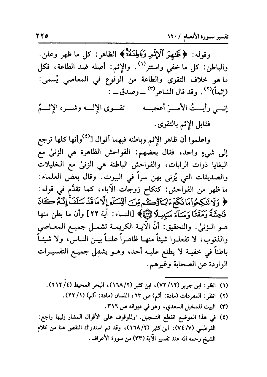 وقولُه: {ظَاهِرَ الإِثْمِ وَبَاطِنَهُ} الظاهرُ: كُلُّ ما ظَهَرَ وعلن. والباطنُ: كُلُّ ما خَفِيَ وَاسْتَتَرَ (¬١). والإثمُ: أصلُه ضدُّ الطاعةِ، فكلُّ ما هو خلافُ التقوى والطاعةِ من الوقوعِ في المعاصِي يُسَمَّى: (إثمًا) (¬٢). وقد قال الشاعرُ - وَصَدَقَ (¬٣) -: